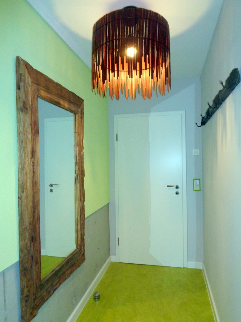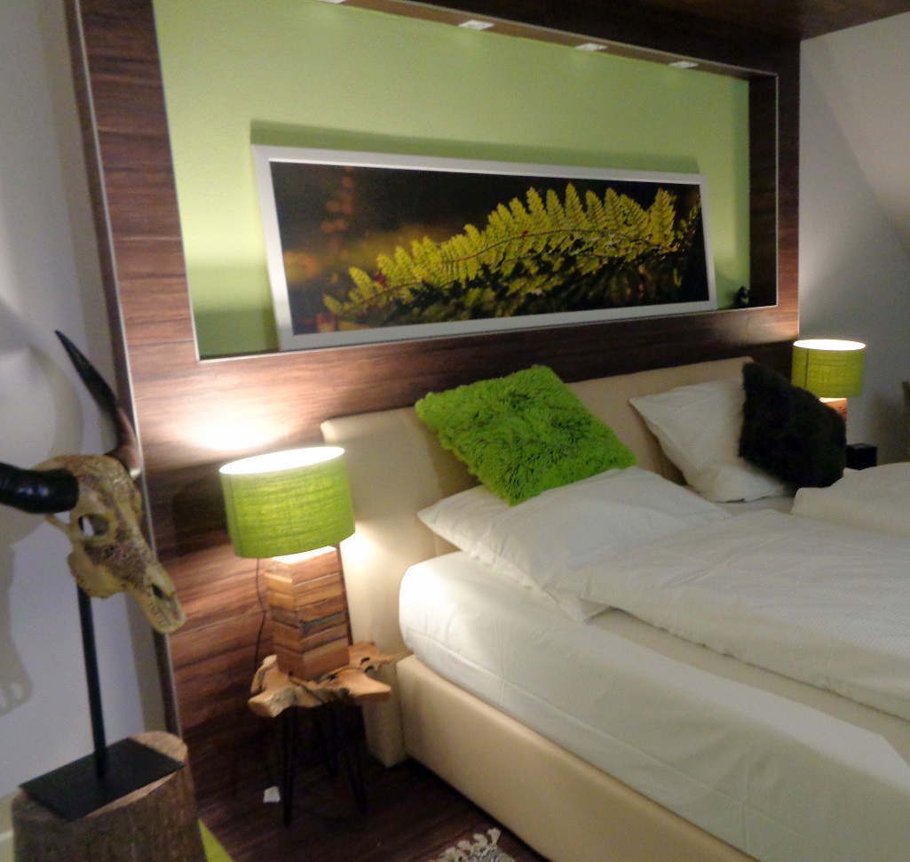 Vielmehr aber an ihrem noch ganz neuen Kunstwerk, dessen Leuchtkraft bereits in den Homepagebildern vorab wunderbar die Botschaft des Hauses transportiert: jeder Mensch hat seine ganz persönliche Farbe. Und so gibt es in der Kunstpension Frahm fünf verschiedene, brandneue, liebevolle, feine und natürlich malerisch schön gestaltete Gästezimmer in den Farben: Weiß, Gold, Grün, Pink und Blau. Da fällt die Entscheidung gar nicht so leicht. Aber zum Glück hatten wir, sagen wir einen buchungsgünstigen Tag erwischt, sodass wir vor Ort die freie Wahl. Eine kleine private Führung durch alle Gästezimmer machte die Entscheidung nicht gerade leichter, da einfach alle ihren ganz besonderen Zauber hatten, doch letztendlich fiel meine Wahl auf Grün.