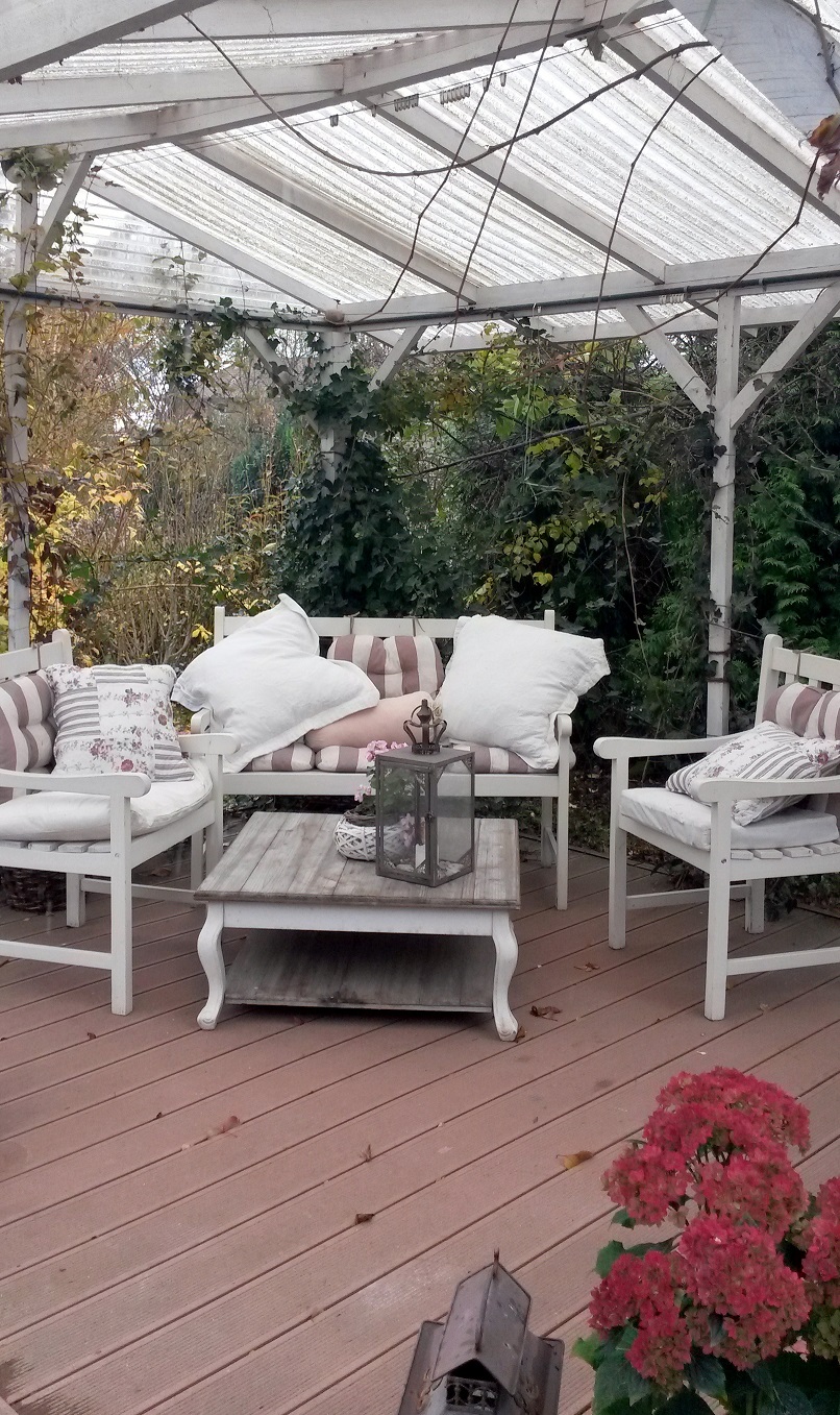 Ein Gang durch den liebevoll gestalteten Garten war selbst bei Schneeregen ein reiner Genuss. Kleine Lauben, Laternen in den Bäumen, Blumen, die in jedes verfügbare Gefäß gepflanzt waren und mittendrin noch eine Gartensauna. Auf Wunsch steht sie ab Nachmittag den Gästen zur Verfügung, kostenfrei. Aber auch hier ist eine Sauna nicht bloß eine Sauna, nein. Davon habe ich mich eines Abends selbst überzeugt. Es war schon ein herrliches Gefühl, nur mit einem Handtuch bedeckt durch den Garten in Richtung Sauna zu huschen und dabei die kalten Schneeflocken auf der Haut zu fühlen. In der Gartensauna duftete es angenehm nach Apfeltee und Zimt und so wurde der Saunagang zu einem echten Wohlfühlerlebnis. Tee, Apfelsaft und selbst gebackene Kekse standen ebenfalls bereit und versüßten den kuscheligen Ruhebereich noch einmal. Entspannung pur. (Natürlich konnte ich dort keine Fotos machen).