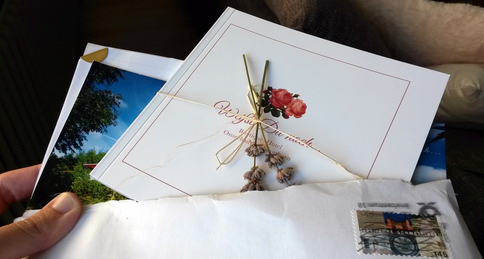 Bereits einen Tag nach meiner Prospektanfrage erhielt ich einen dicken Briefumschlag, gefüllt mit einem feinen Hausprospekt, der von einem Bastband mit zwei getrockneten Blüten umwickelt war. Liebe bis ins kleinste Detail. Schon damals glänzten meine Augen vor Begeisterung. Aber auch die handschriftliche und supersympathisch geschriebene Postkarte vom Haus als Anschreiben berührte meine Hotelseele.