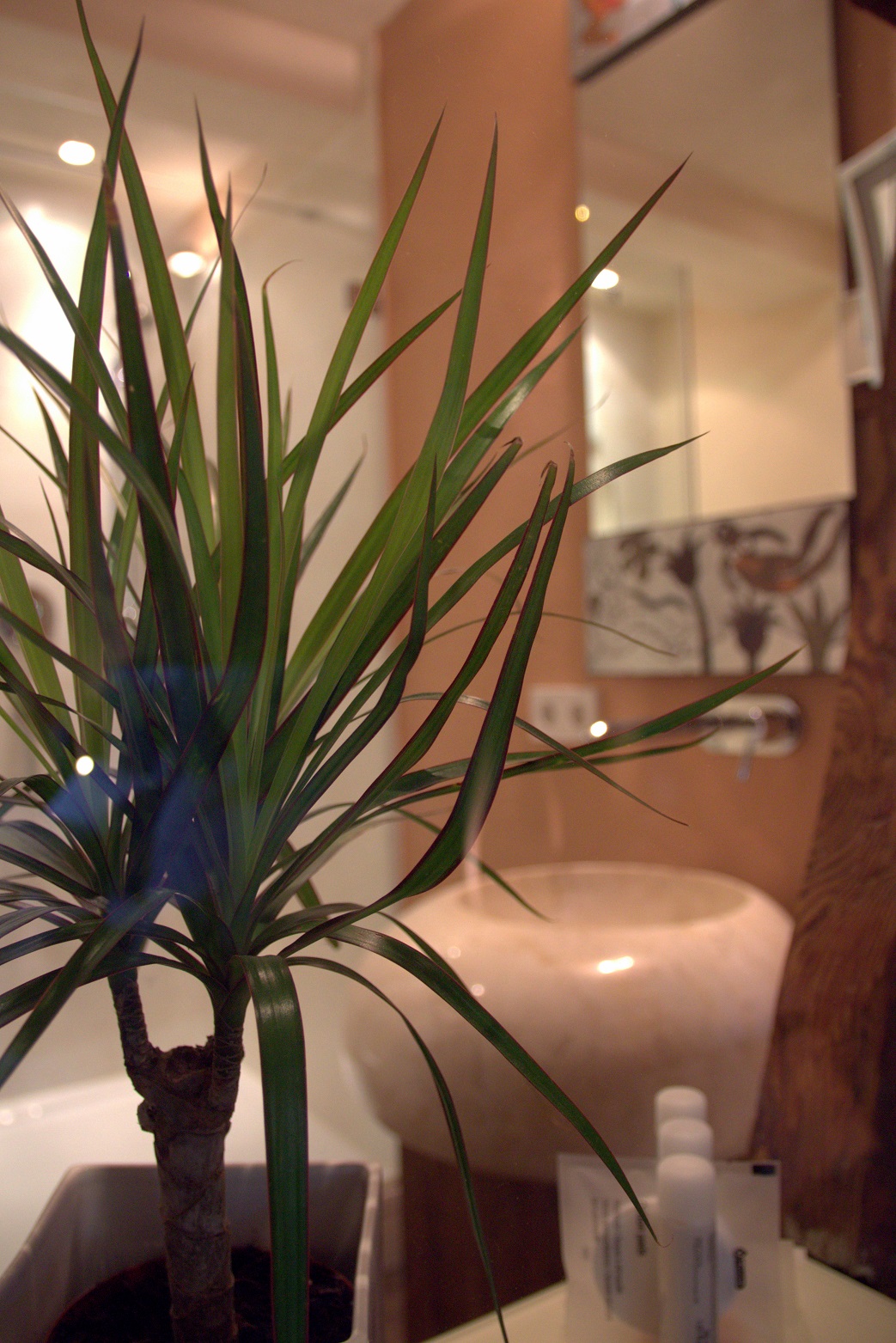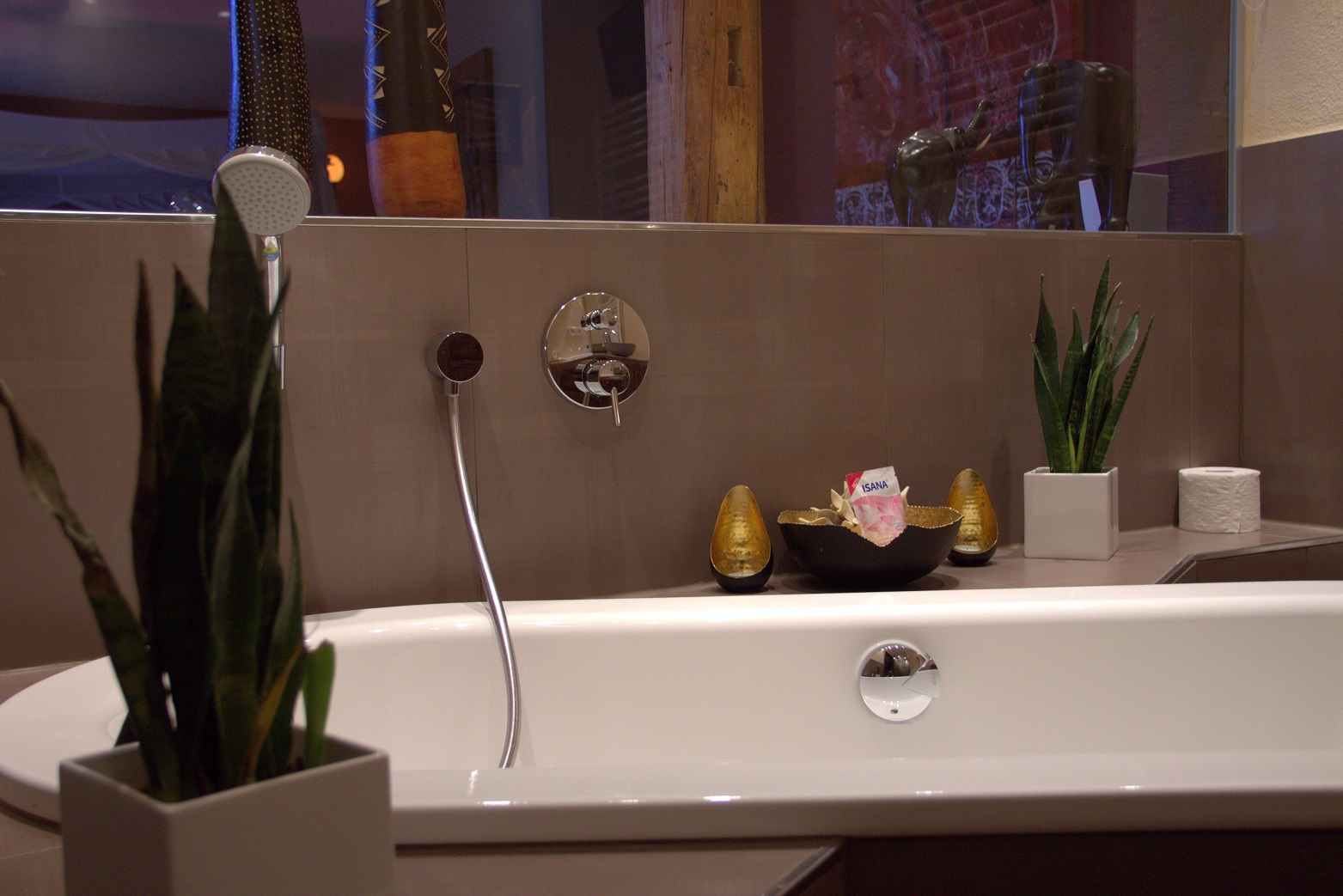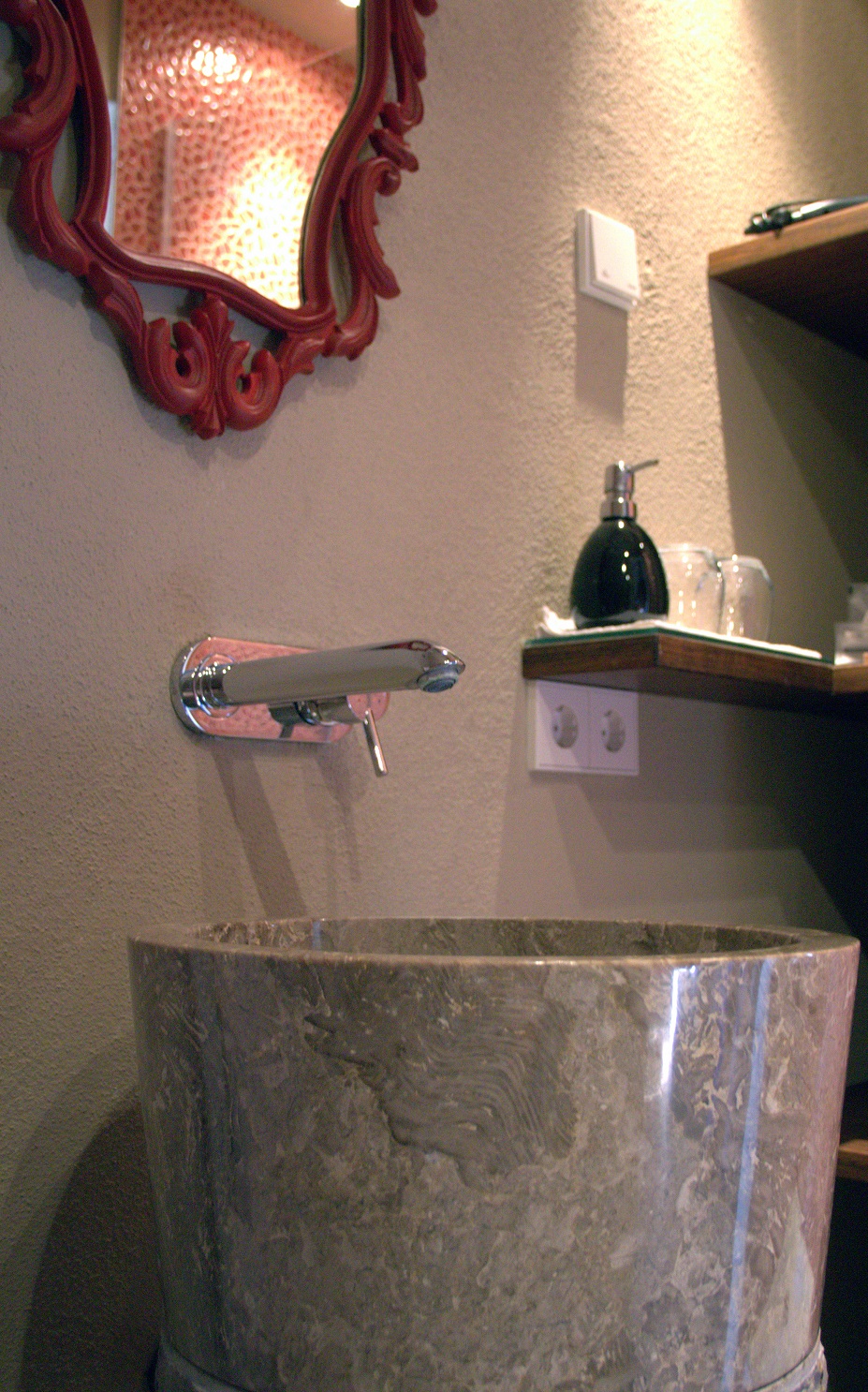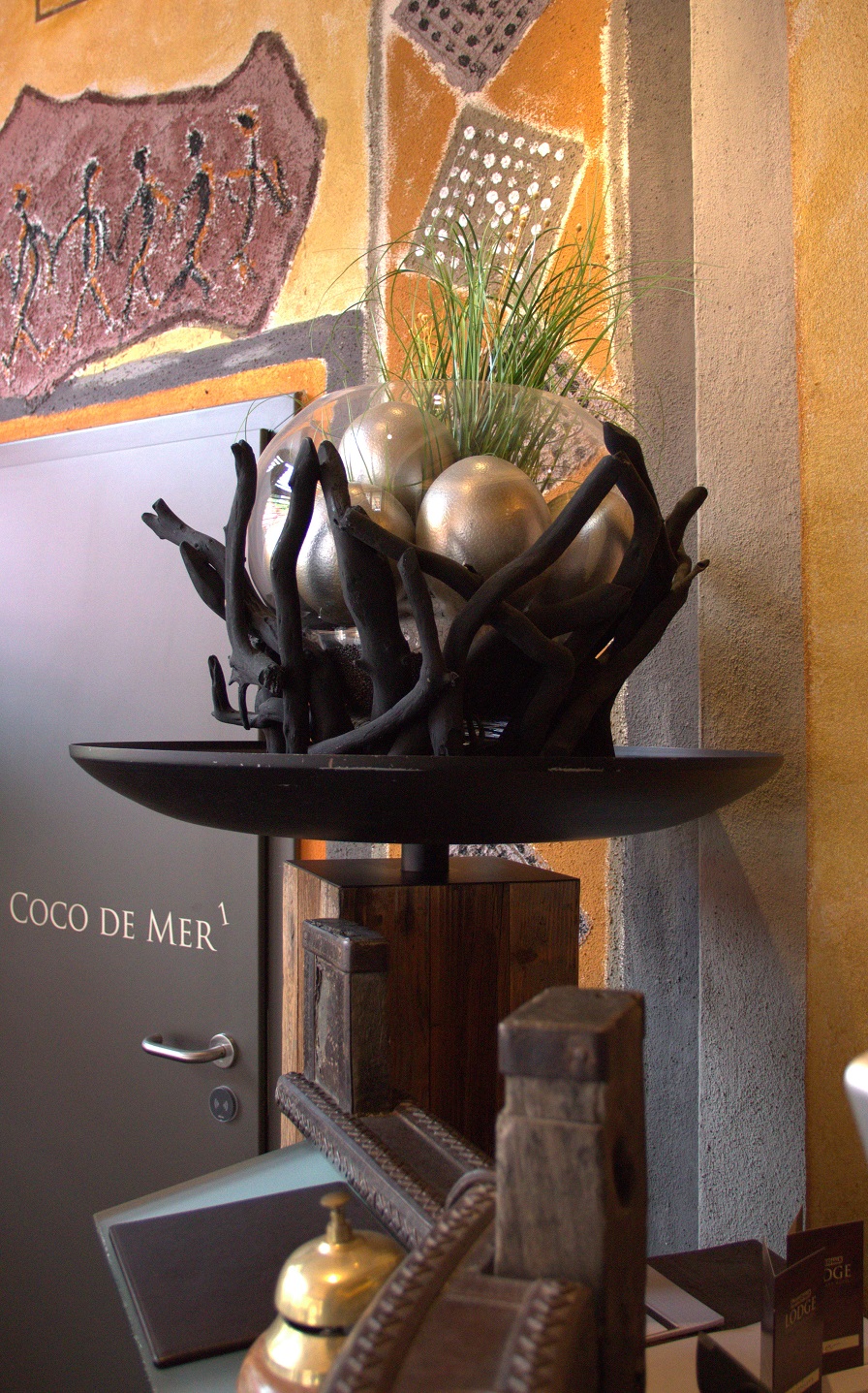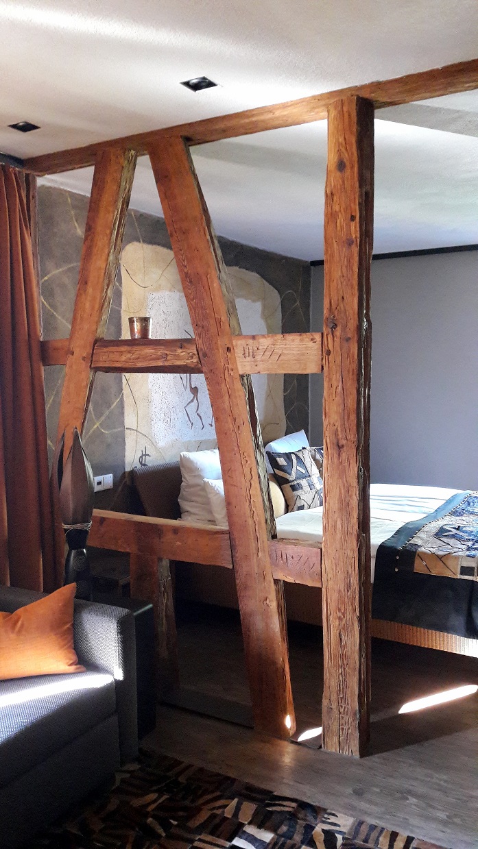 Aber das Glück war auch meiner Seite, als sich beim Auschecken die Gelegenheit bot, sich fast jedes dieser Gästezimmer anzuschauen und zu fotografieren. Beginnend mit unserem Reich für eine Nacht, dem „Baobab“, welches als kleinstes Zimmer durch eine wunderschöne Raumaufteilung, dank einer gläsernen Wand zwischen Bad- und Schlafbereich und vielen weiteren liebevoll arrangierten Details den afrikanischen Rhythmus Wirklichkeit werden lässt. Am meisten faszinierten mich das feine Spülsteinbecken im Bad und die freigelegten Fachwerkbalken.