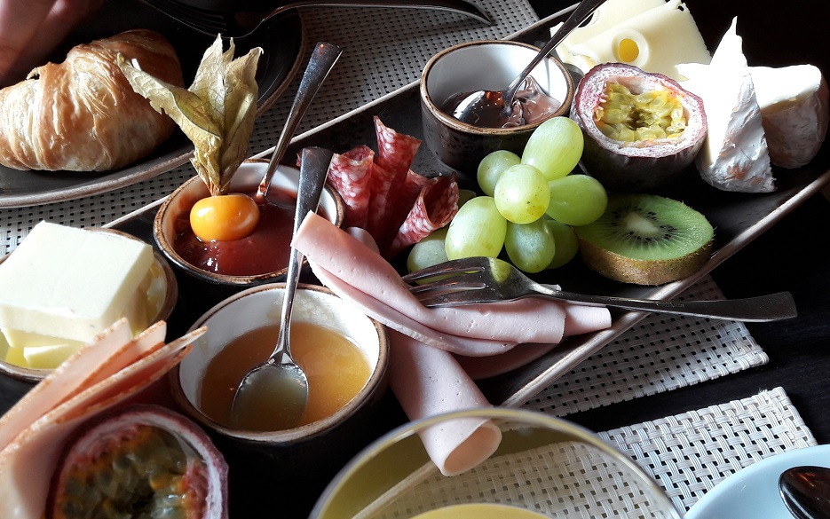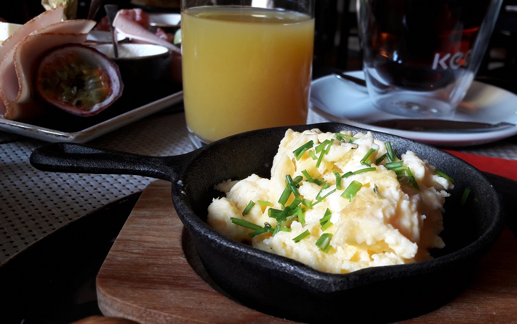 Und zum Glück ließen wir uns auch das erstklassige Frühstück nicht entgehen. Die feine Präsentation dieses kleinen aber sehr feinen Frühstücks begeisterte mich von Kopf bis Fuß. Kerstin brachte uns eine üppige Platte, die schon alleine der reinste Augenschmaus war. Käse, Wurst, Marmelade, Honig & frische Früchte, wie z.B. aufgeschnittenen Maracujas – es war so unglaublich appetitlich angerichtet, dass ich fast vergaß, davon zu essen 😛 Dazu wurde frisch zubereitetes Rührei gereicht, das in kleinen Pfännchen zum Tisch gebracht wurde. Auf Wunsch hätten wir auch noch Obstsalat bekommen. Super gut. Und das alles für gerade mal 10 € pro Person! So wundert es auch nicht, dass am Wochenende viele Außer-Haus-Gäste nur wegen des köstlichen Frühstücks vorbei kommen.