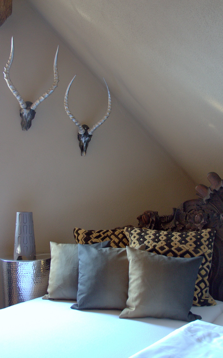 Ein Stockwerk höher gab es noch drei weitere Zimmer für mich und meine Kamera zusehen. Das „Nungubais“ mit seinem begehbaren Kleiderschrank hinter schweren antiken Holztüren hatte genauso seinen Charme, wie das „Lions Head“, welches sich auf zwei Ebenen erstreckt, und zwar mit einem Bett direkt unter dem Dachgiebel inklusive Blick durch das Dachfenster auf den Sternenhimmel. Die angrenzende „Impala-Lounge“ bot mit einem original afrikanischen Bett einen tollen Abschluss meiner Hotelführung.