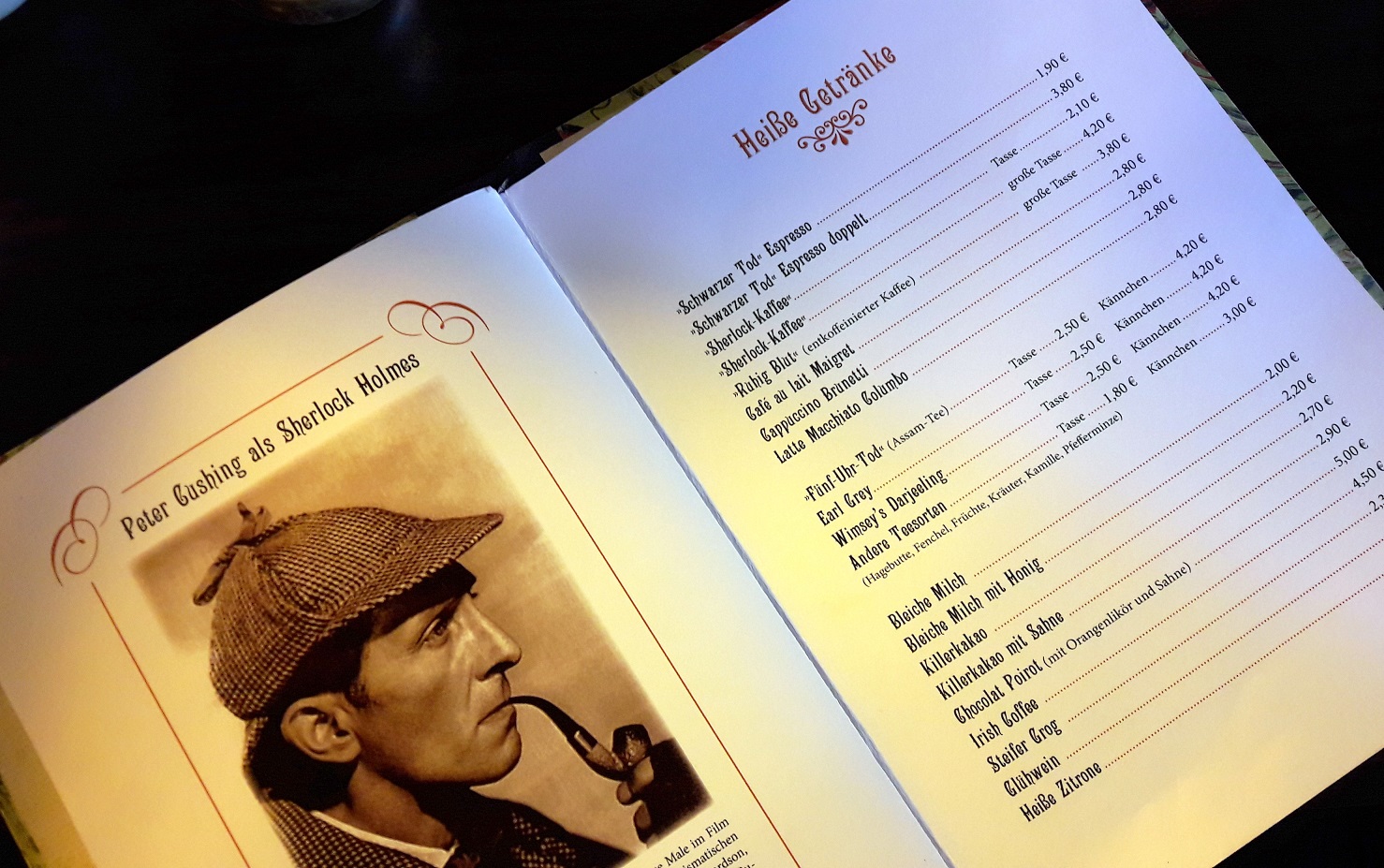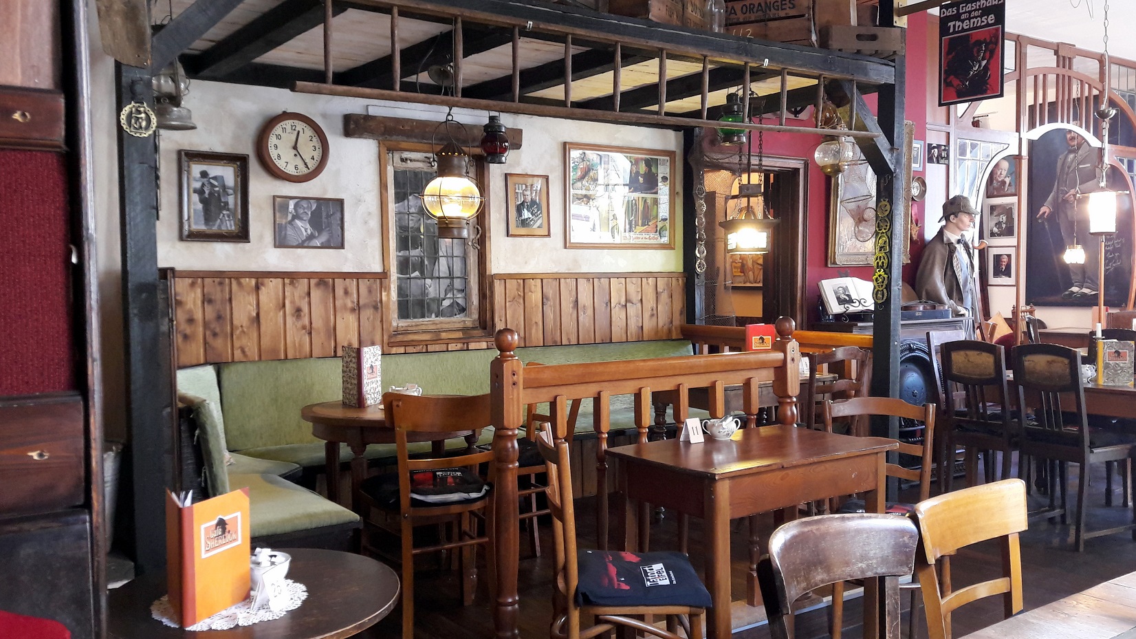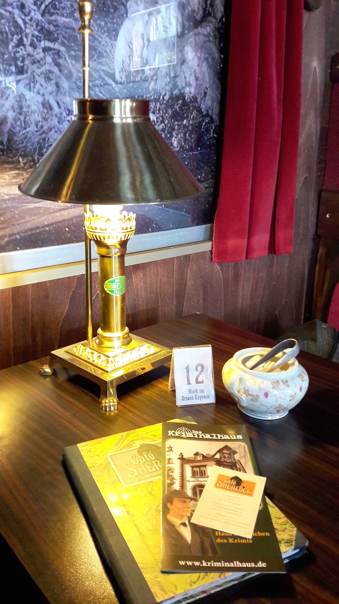 Eigentlich hätten die beiden ja am Miss-Marple-Tisch Platz nehmen müssen, der, unter einer großen Glasplatte in der Tischmitte, so allerlei Requisiten der bekannten Agatha Christie Reihe zeigt (wie z.B. eine Karte von St. Mary Mead oder den Schlüssel von Bertram´s Hotel). Und noch viele weitere dieser unzähligen Details verteilen sich im gesamten Cafébereich, sodass man sich als Gast in einer fantastischen Krimiwelt mit allen berühmten Persönlichkeiten wiederfindet. Ob Sherlock Holmes als lebensgroße Puppe, die Kanzel von Pater Brown oder die Nachbildung des Gasthauses an der Themse – Deutschlands ältestes Krimicafé könnte kaum originalgetreuer eingerichtet sein.