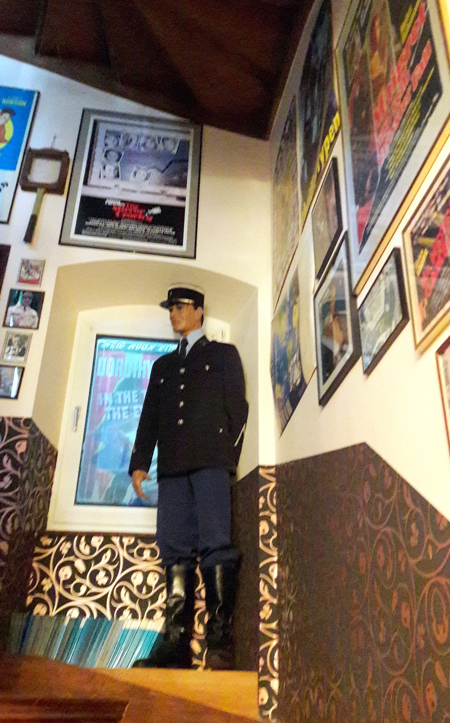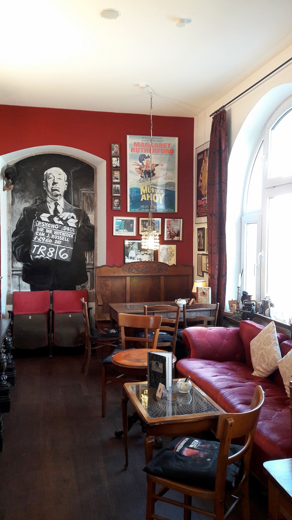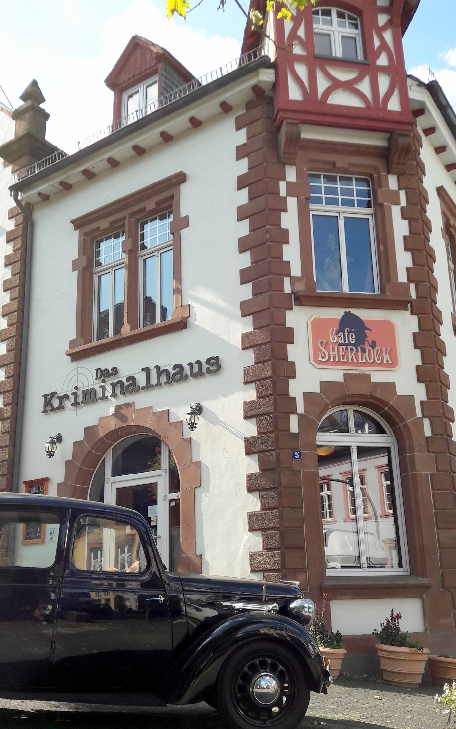 Eigentlich hätten die beiden ja am Miss-Marple-Tisch Platz nehmen müssen, der, unter einer großen Glasplatte in der Tischmitte, so allerlei Requisiten der bekannten Agatha Christie Reihe zeigt (wie z.B. eine Karte von St. Mary Mead oder den Schlüssel von Bertram´s Hotel). Und noch viele weitere dieser unzähligen Details verteilen sich im gesamten Cafébereich, sodass man sich als Gast in einer fantastischen Krimiwelt mit allen berühmten Persönlichkeiten wiederfindet. Ob Sherlock Holmes als lebensgroße Puppe, die Kanzel von Pater Brown oder die Nachbildung des Gasthauses an der Themse – Deutschlands ältestes Krimicafé könnte kaum originalgetreuer eingerichtet sein.