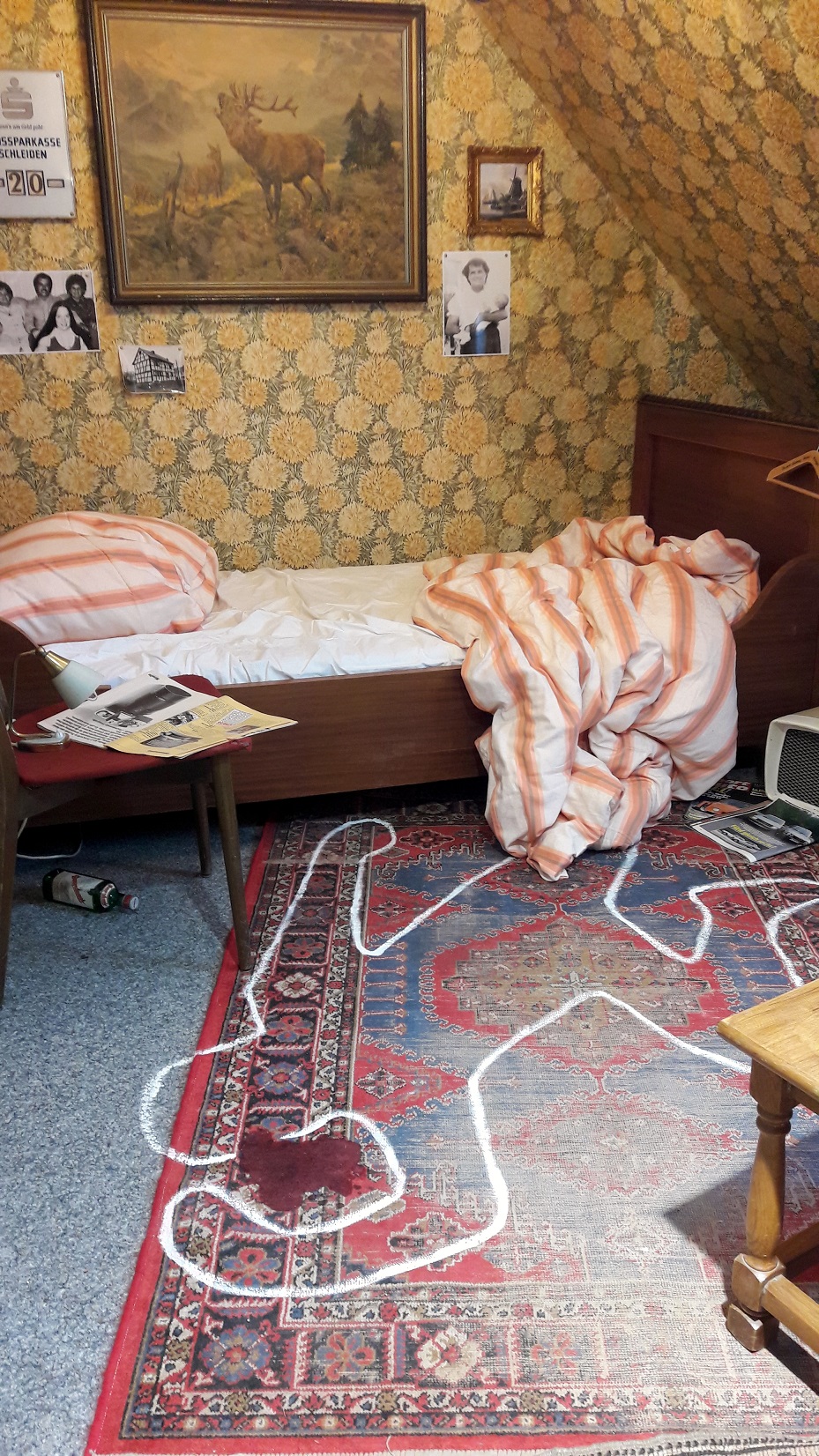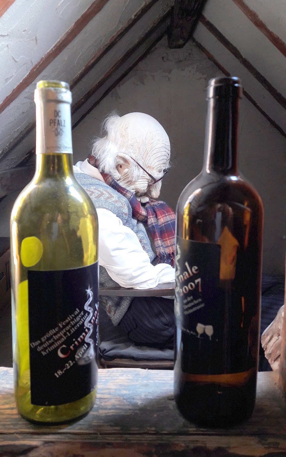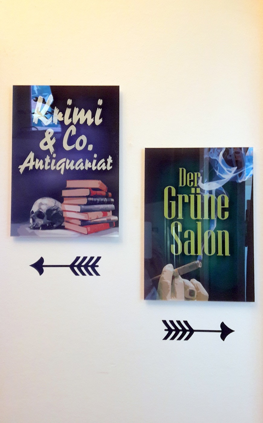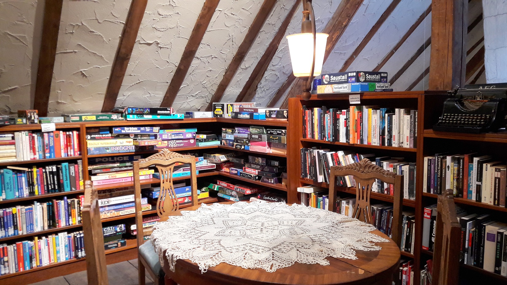 Und wenn man dann noch nicht genug gesehen hat, sollte man sich noch eine kleine Wendeltreppe höher in die Dachbodenspitze begeben, wo 70 internationale Krimispiele auf ihre Fans warten. Eigentlich möchte man sich sofort für eine Nacht hier einschließen lassen. Doch aufgepasst, nicht dass am nächsten Morgen noch jemand einen Mordfall lösen muss 😛 Auch DAS wird übrigens angeboten – direkt neben dem Krimiarchiv gibt es einen konstruierten Mordschauplatz, den man in einigen Stunden mit einer Krimiakte und guten Freunden lösen sollte.