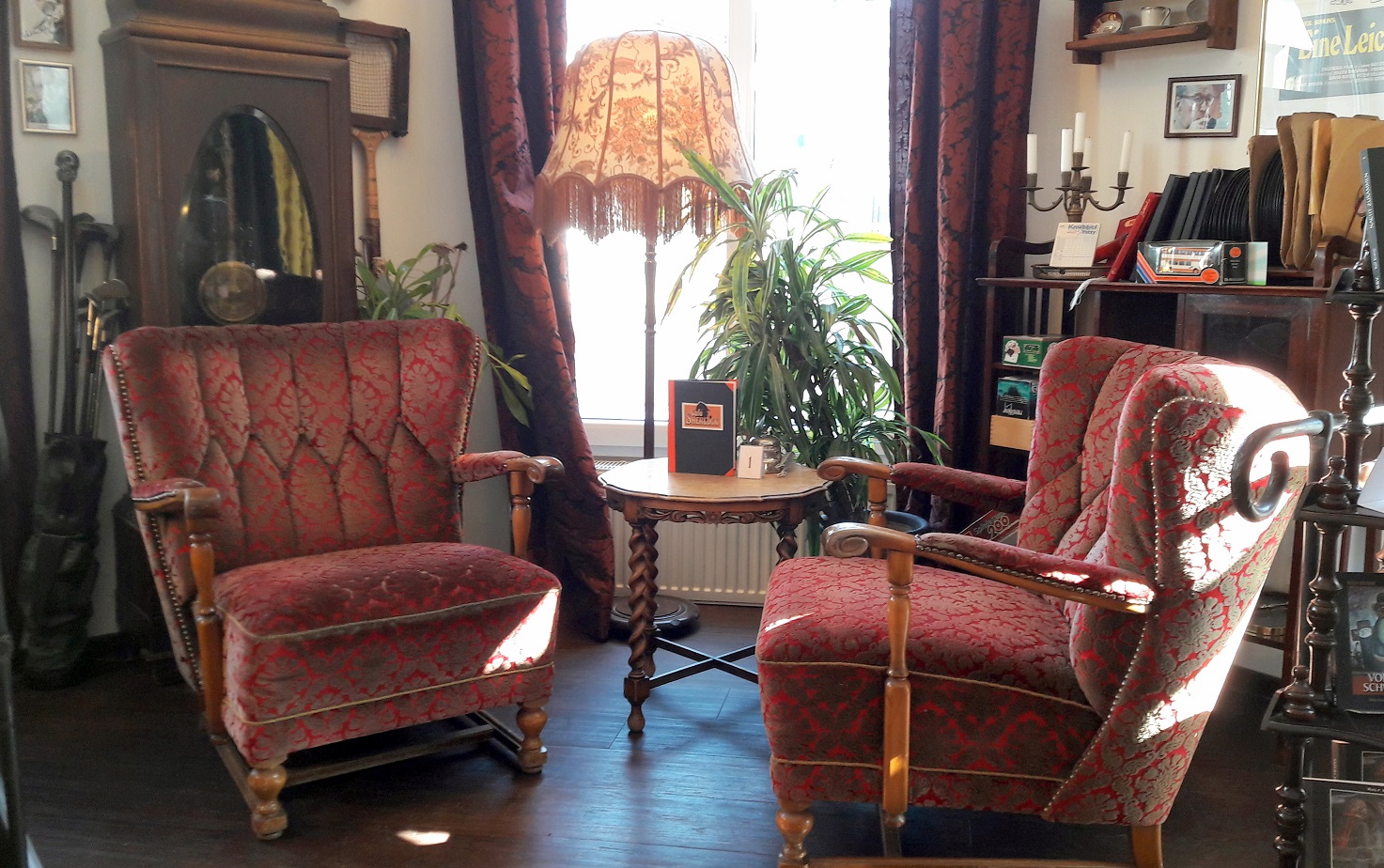 Wer dieses besondere feine Plätzchen erschaffen hat? Dazu sollte man erstmal wissen, dass das Krimicafé Sherlock in einem ganzen Krimihaus! liegt, welches neben dem Café im Erdgeschoss noch über einen grünen (Raucher-) Salon in der 1. Etage sowie dem dort angrenzenden Antiquariat verfügt.
