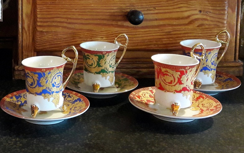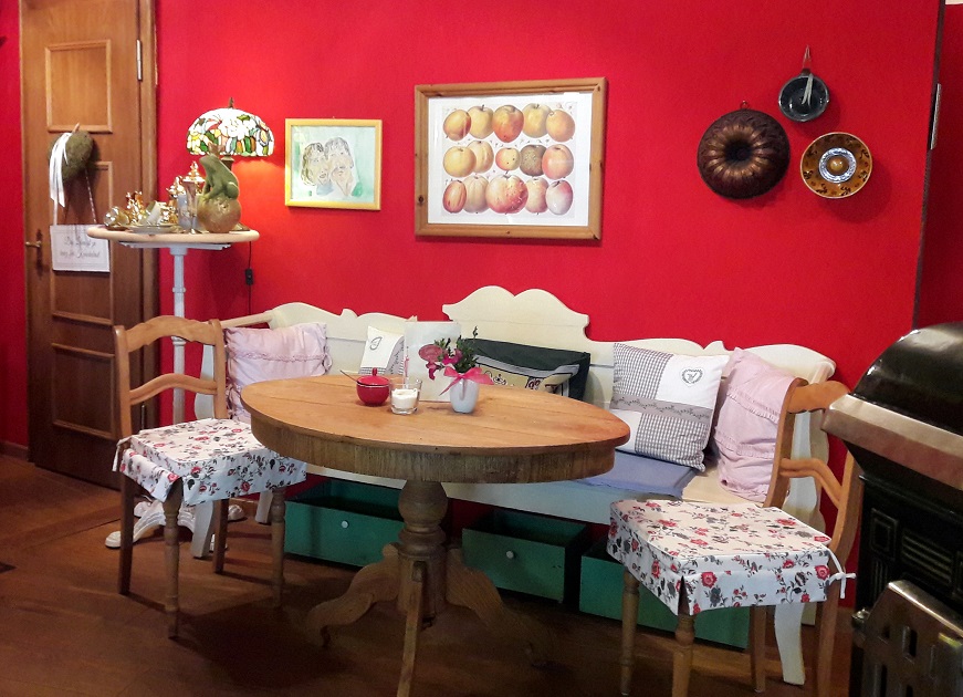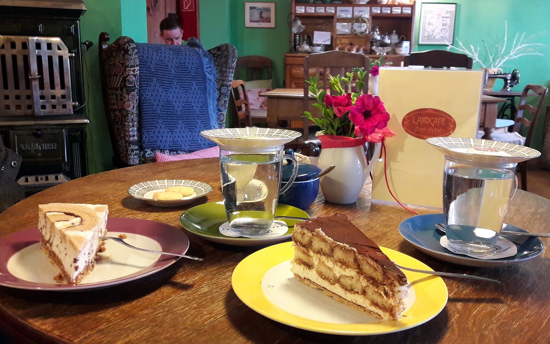 Wir entschieden uns für Letzteres und sanken direkt in eine andere Welt. Eine Welt, die sofort entspannend und beruhigend wirkt, in der man aufeinmal Zeit hat und sich ganz dem guten Gefühl widmet, welches sich gerade durch den ganzen Körper zieht. Es mag an den frischen Blumen in kleinen Milchkännchen auf den Tischen liegen, oder an den Teelichtern in feinen Vintage-Tassen. Vielleicht aber auch an den farblich in satten Apfelrot und Grüntönen gestrichenen Wänden, die wiederum von alten Bildern, Kuchenformen und sonstigen Dekorationen geschmückt werden. Zarte Leinenkissen verzieren die Stühle & Bänke und auf so mancher antiken Anrichte finden sich edle Mokkatassen wieder.