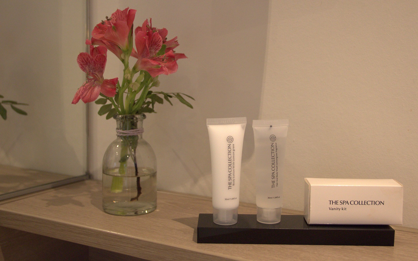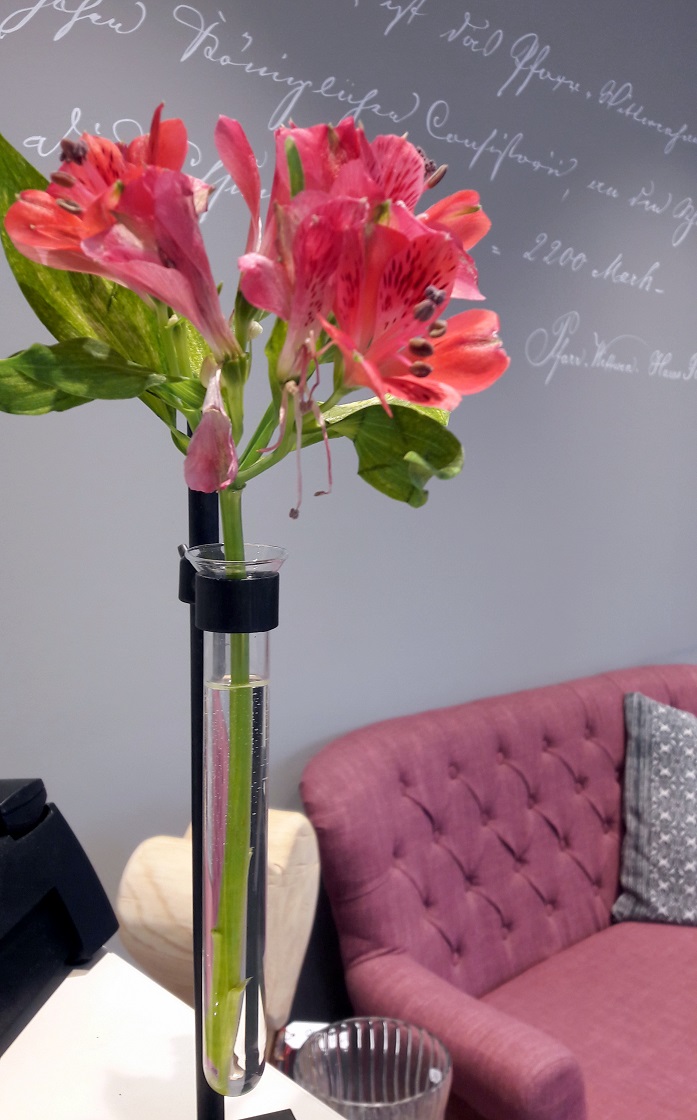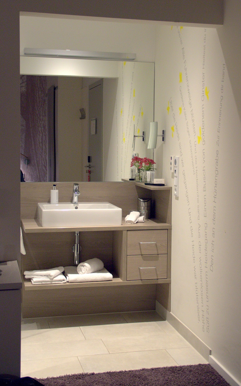 Aber das Highlight dieses Zimmers hab ich ja noch gar nicht erwähnt: es ist das Bad, welches offen vom Zimmer aus begehbar ist. Das Löns-Gedicht ist kunstvoll auf eine Tapete gedruckt, und wirkt wie ein fröhlicher Blumenstrauß. Und zu meiner großen Freude gab es sogar eine echte Blüte im Bad (was man leider in den wenigsten Hotels noch findet). Zur linken Seite geht man dann weiter in die Dusche, und dahinter schließt sich der WC-Bereich (natürlich abtrennt durch eine Tür) an. Ziemlich kunstvoll und eine äußerst schicke Idee. Man könnte auch sagen: ganz schön schmuck 😉