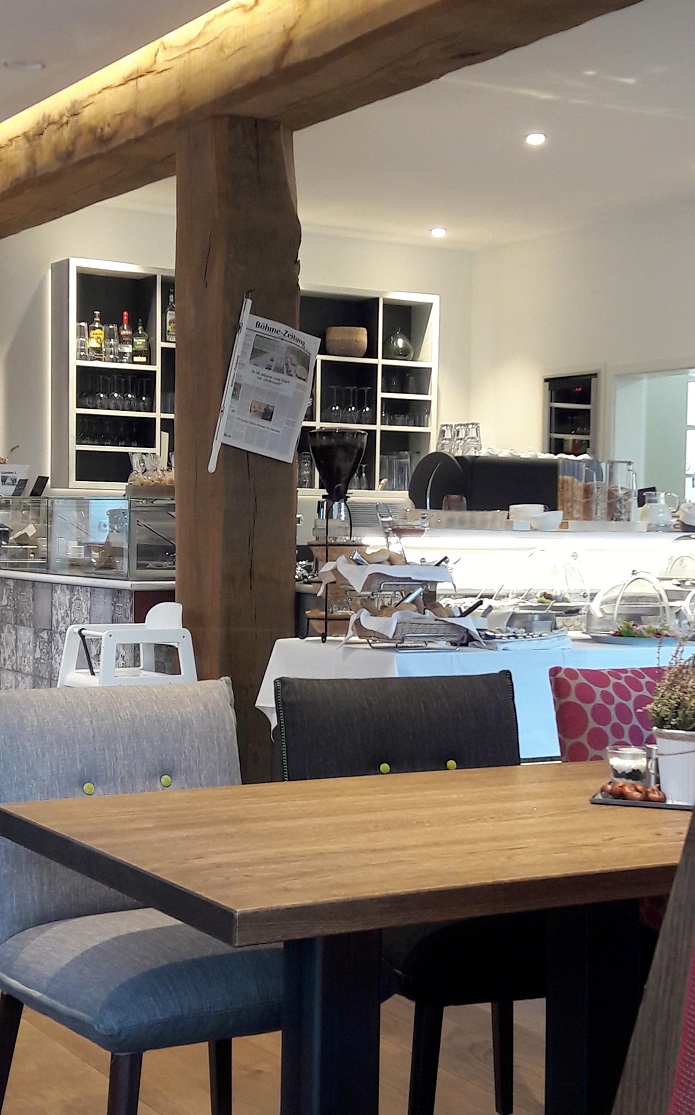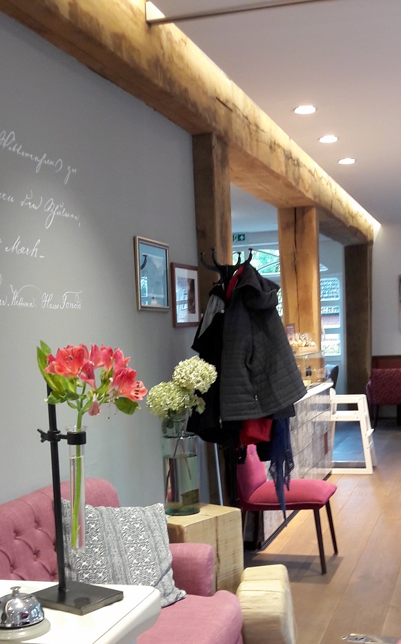 Noch einen Tag vor unserer Anreise hatte ich nach Fachwerkhotels im Netz gestöbert und gehofft, etwas Feines zu finden. Doch dass ich längst eines der allerfeinsten Fachwerkhotels gebucht hatte, hatte ich gar nicht auf dem Schirm, sondern erst als wir davor standen. Von innen sind die einzelnen Fachwerkbalken akkurat freigelegt und aufgearbeitet worden, sodass man sich als Gast kaum entscheiden kann, wo man Platz nehmen möchte.