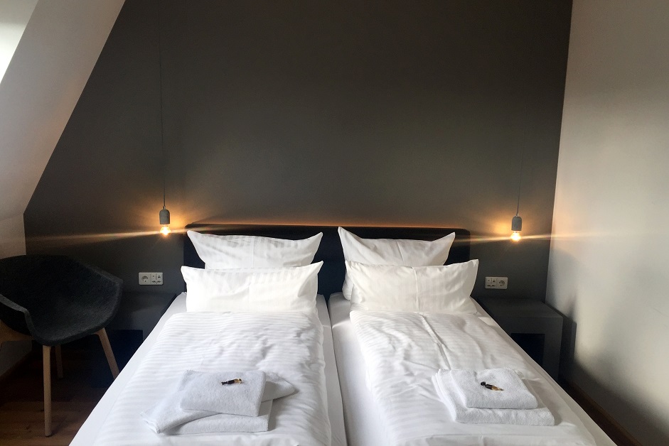 Unser zugeteiltes Themenzimmer hieß ‚Walter‘ und war in sachlichen Grautönen gehalten, wie Ihr gleich auf den Fotos sehen werdet. Eines darf man sagen – jedes Thema ist eine Klasse für sich 🙂 Schon vorab hatte ich gefühlt Stunden auf der Homepage verbracht und mir jedes Zimmer und seine Bilder genau angeschaut. Ob ‚Charlie‘ (im Fabrikstil mit Backsteinwand und Vintagetelefon), ‚Max‘ (im Sportstil mit Spind, Medizinball und Sprungkasten), oder ‚Christoph‘ (angelehnt an Christopher Columbus mit Globus auf dem Schreibtisch und Reisekoffer) – diese Themen sind einfach köstlich anzuschauen und erstklassig umgesetzt.