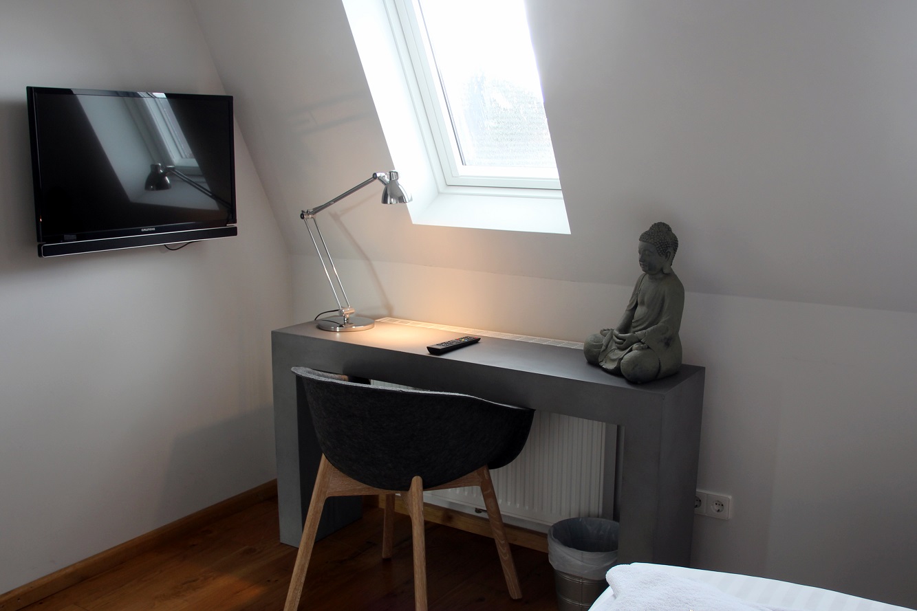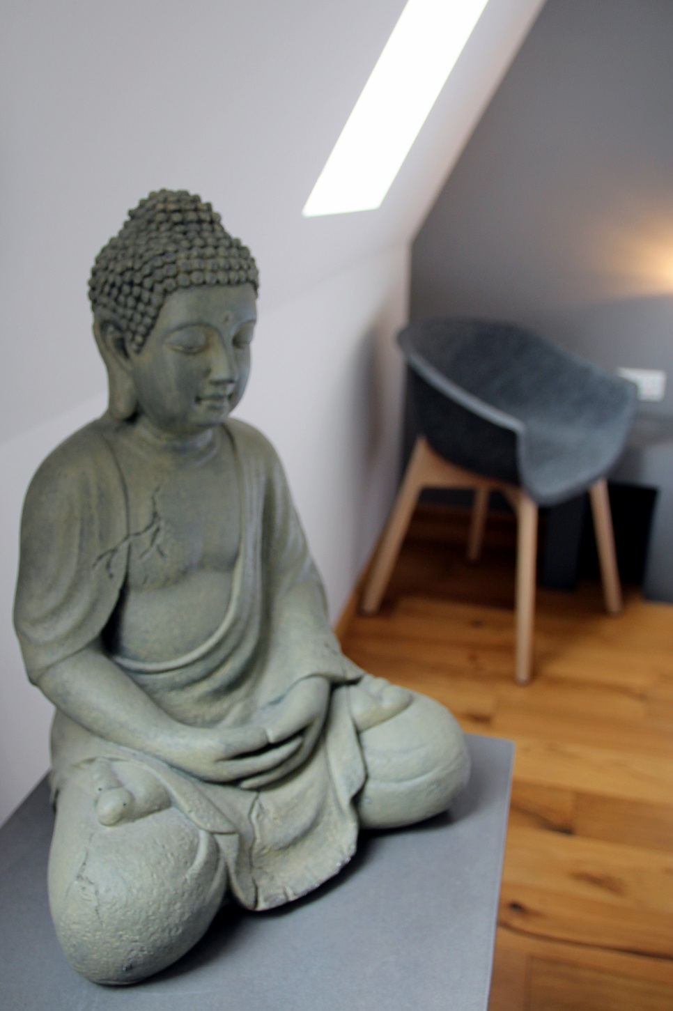 Um nicht das Zimmer zu vergessen – dieses war ebenfalls im schicken und modernen Grau gehalten, samt Buddha Figur, die auf dem Schreibtisch unterm Fenster thront. Dazu ein ziemlich cooles Beleuchtungskonzept, welches sich vom Bett aus komplett steuern lässt. Natürlich gibt´s auch ein kleines Betthupferl und ein feines Kissenmenü, welches einen herrlichen Schlaf ermöglicht.