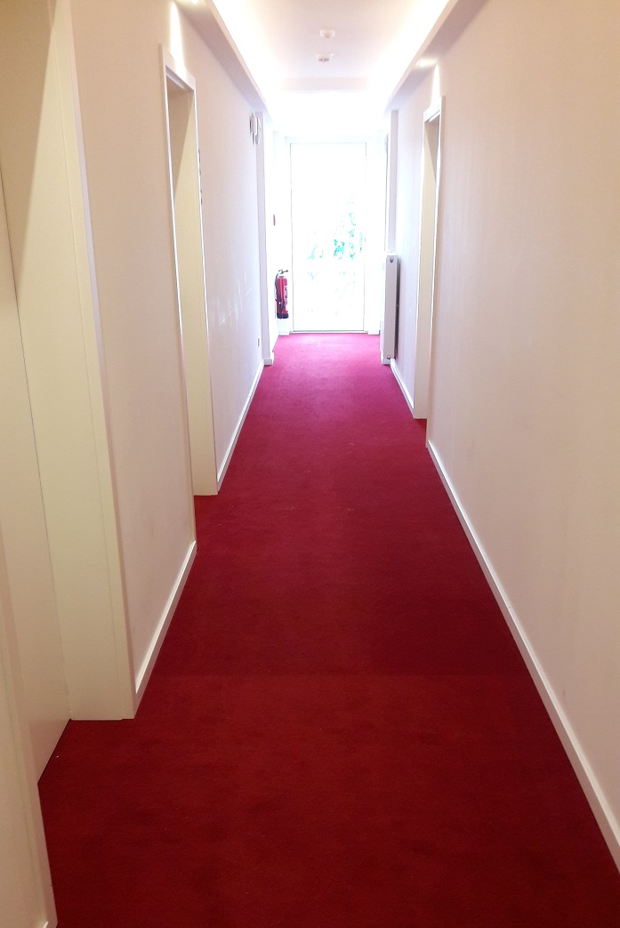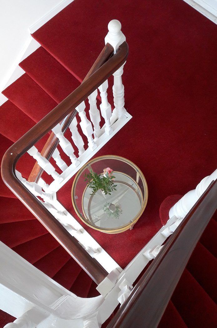 Nun spazierten wir erstmal zu unserem Zimmer. Es gibt natürlich auch einen Fahrstuhl, aber wir nahmen das Treppenhaus, in dem auf jeder Etage, genau wie im Restaurant und auf dem Rezeptionstresen, frische Blumen standen. Ich liebe diese schönen Details, spiegeln sie doch die Seele eines Hotel. Dazu ist überall im Flur und im Treppenhaus ein roter Teppich ausgelegt, eben eine sehr stilvolle Villa.
