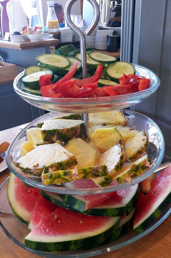 Und wer hätte es gedacht, am nächsten Morgen hatte das Villa Stern Team schon ein feines und reichhaltiges Frühstücksbuffet aufgebaut. Gerade als wir davor standen, wurde eine große Etagere mit Rohkost und frisch aufgeschnittenen Obst dazu gestellt. Und das Obst schmeckte, meine Güte, diese Ananas. Ja, Wippi und ihr Obst 😉
