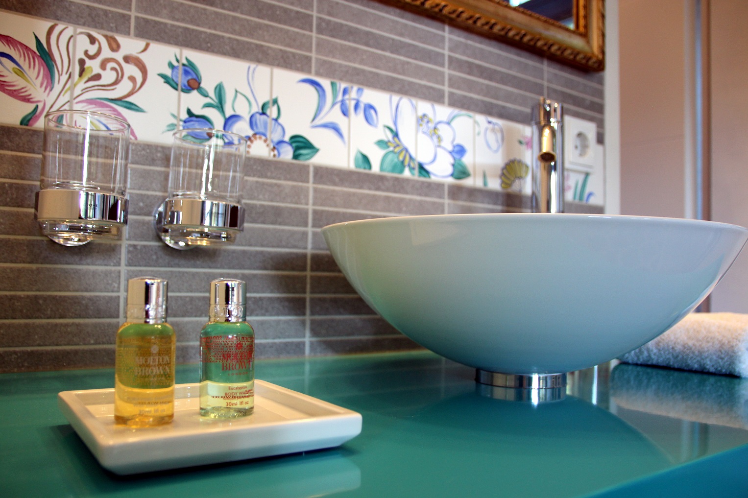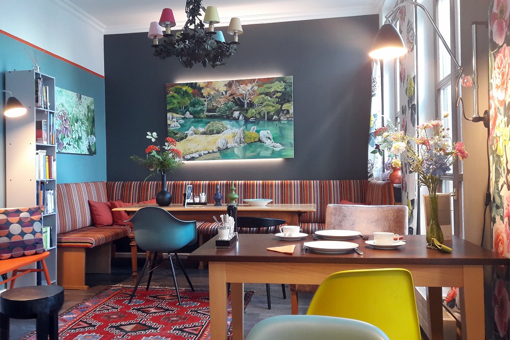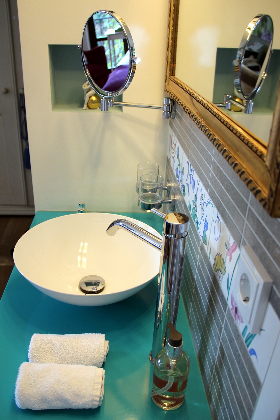 Wir wählten das Zimmer „Lotus“ – eine wundervolle, einfach himmlische Mischung und Kombination unterschiedlichster Farbtöne (mit Türkis als Hauptton). Dazu kam das bezaubernde Blütenmuster, welches Herr Paulsen selbst gemalt hat. Damit meine ich aber nicht nur die Leinwand, sondern auch das Fliesenmuster in Bad und die dazugehörige Bordüre über dem Waschtisch. Wow, wow und nochmal wow. Bis dahin dachte ich immer, mein Kopf sei schon kreativ, aber weit gefehlt. Das gesamte Hotel ist ein einziges Meisterstück. Wohlfühlfaktor = 100%.