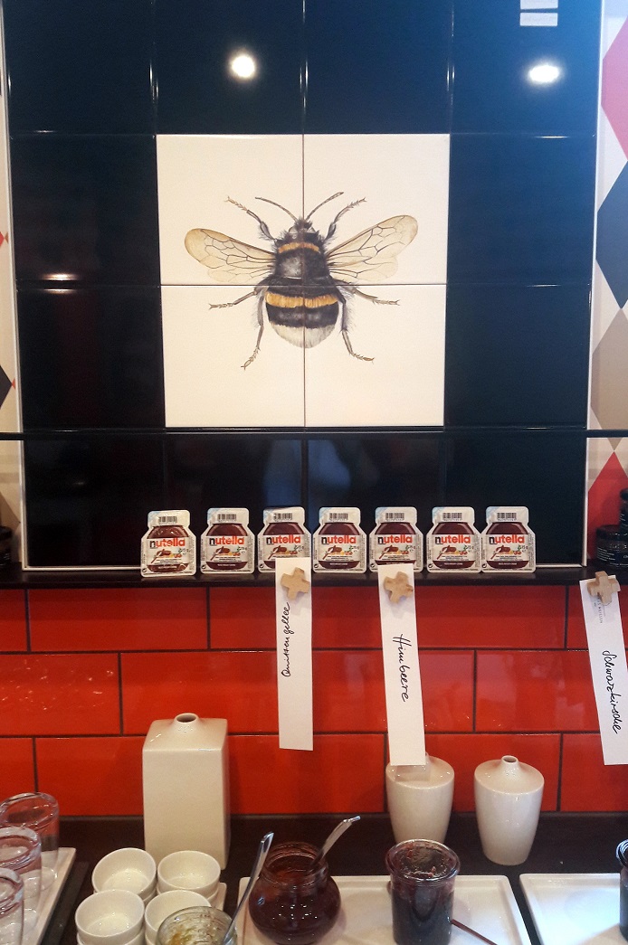 Da waren z.B. die kleinen Eierbecher, getarnt als Mini-Mini-Eimer 😉 Oder die Honigmarmelade, die in kleinen Gläschen als Pyramide arrangiert an einer Fliesenwand im Regal standen – und die Fliesenwand eine überdimensionale Biene zeigt. Am liebsten hätte ich mich einfach direkt an das Buffet gesetzt, um beim Frühstücken weiter diese wundervollen Details zu bestaunen.