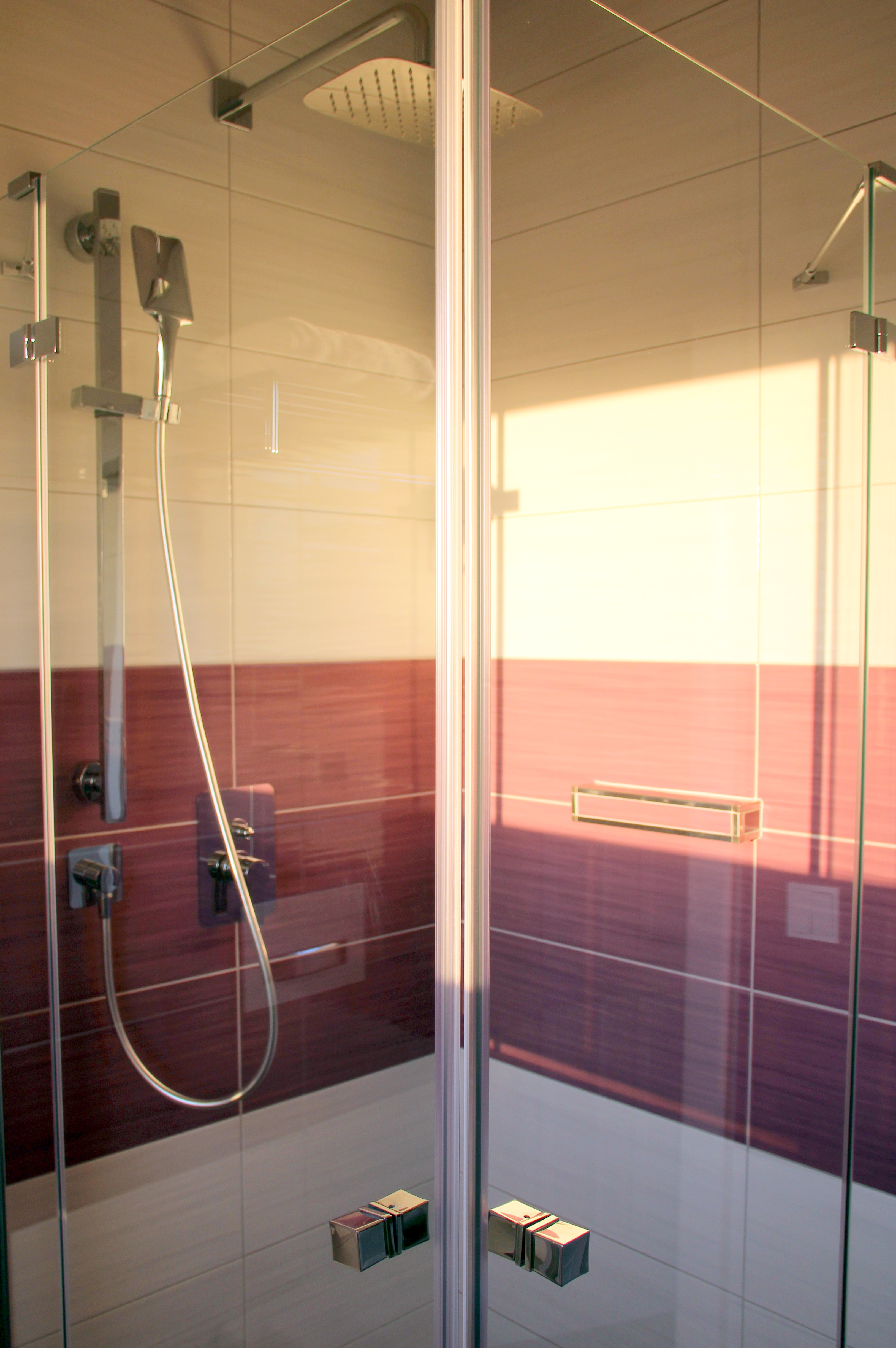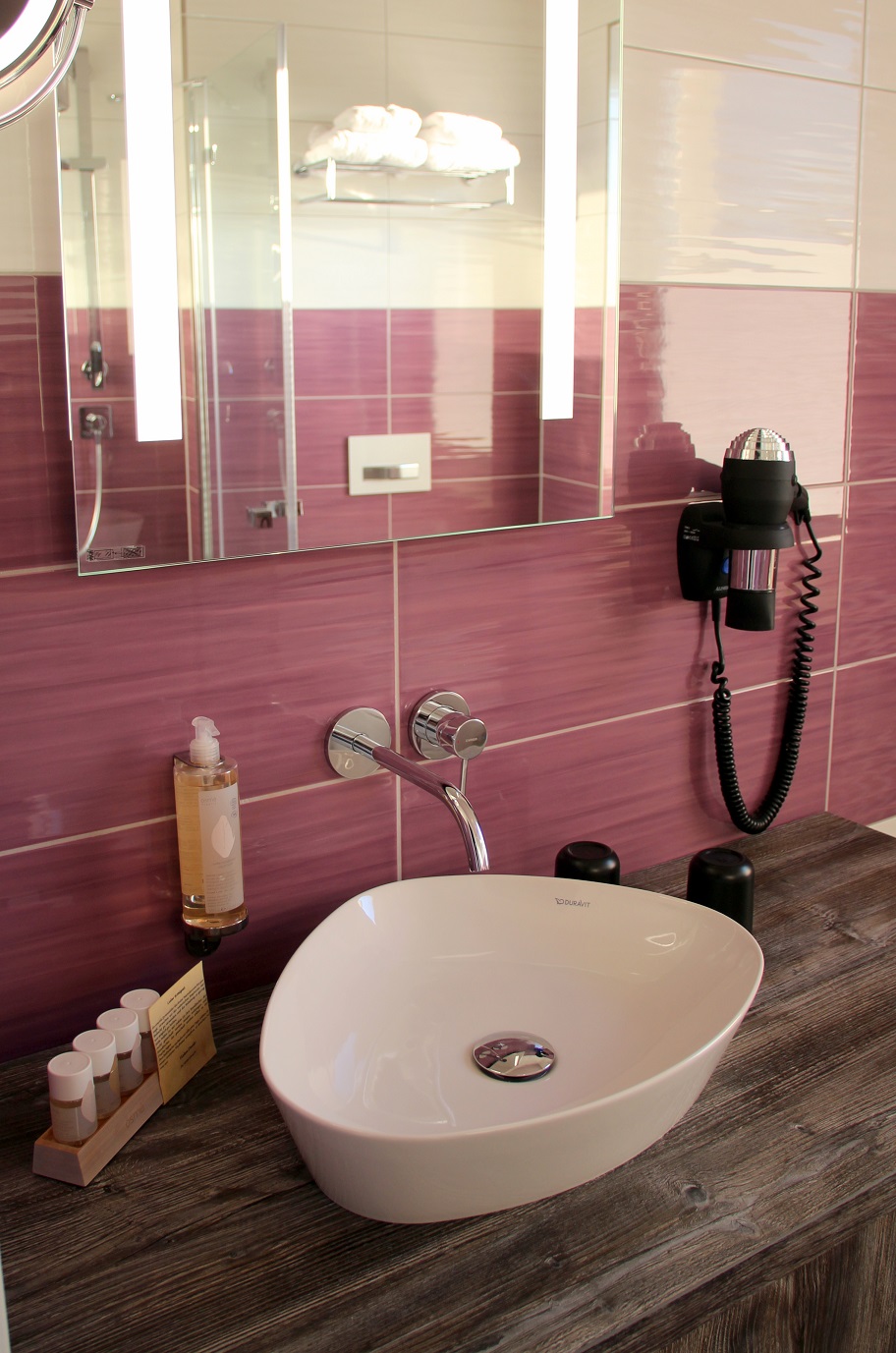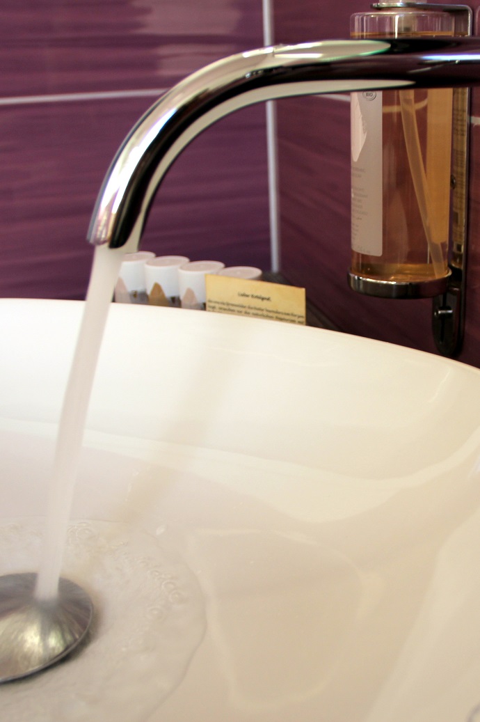 Und auch das Bad verdient es, nochmal extra erwähnt zu werden – hochwertige Pflegeprodukte sowie eine echt große Ablagefläche (für uns Frauen ja immer ganz wichtig :-)). Dazu eine schicke Glasdusche mit einem tollen rechteckigen Brausekopf (*grins*, ich hätte auch nie gedacht, dass ich mal begeistert von einem Duschkopf sprechen würde:-P).