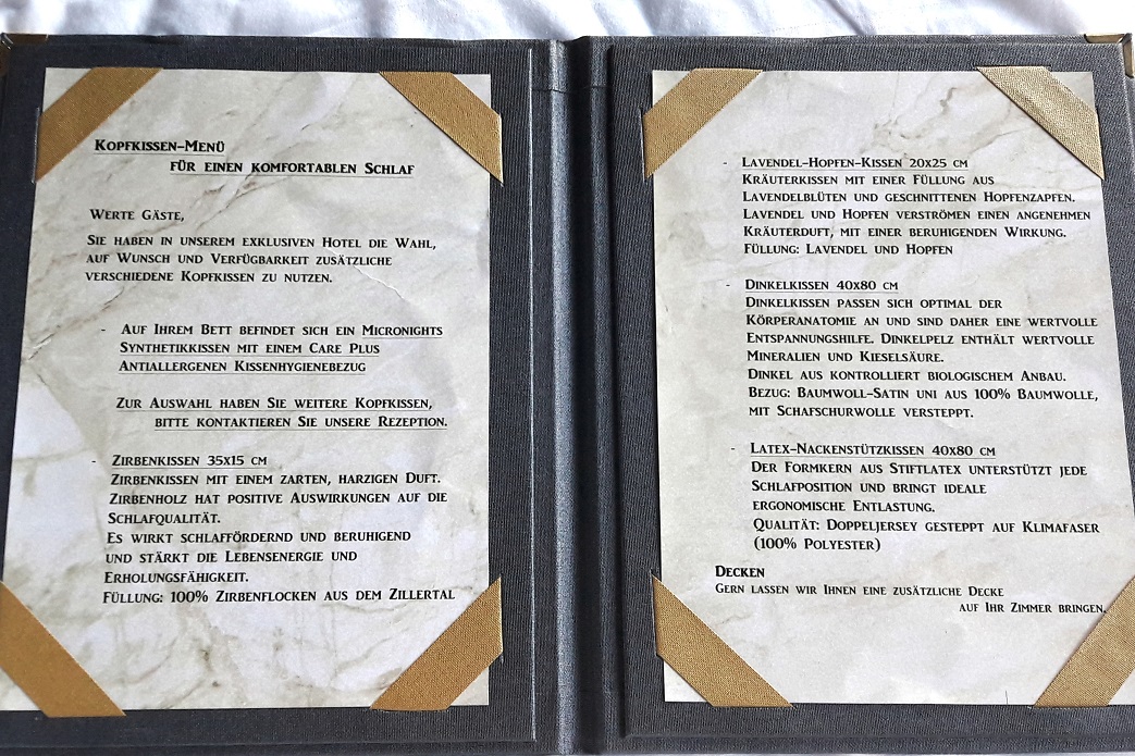 Auf dem schicken Bett wartet bereits das Begrüßungsgeschenk – eine kleine Flasche Leinöl – „wir wollten mal was ohne Gurken machen“ ;-). Wow toll, in welchem Hotel bekommt man heutzutage noch ein Gastgeschenk? Dieses lag übrigens auf der Kissenmenü-Karte. Ja richtig, es gab ein eigenes Kissenmenü, quasi wie eine Speisekarte, aus der man auch ein Zierben-, Lavendel-Hopf- oder Dinkelkissen hätte auswählen können. Spitzenklasse!