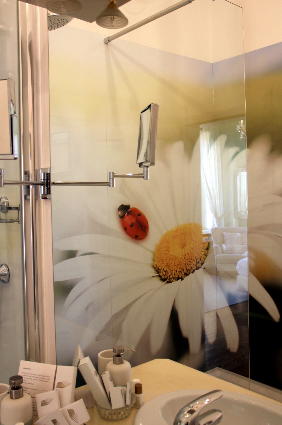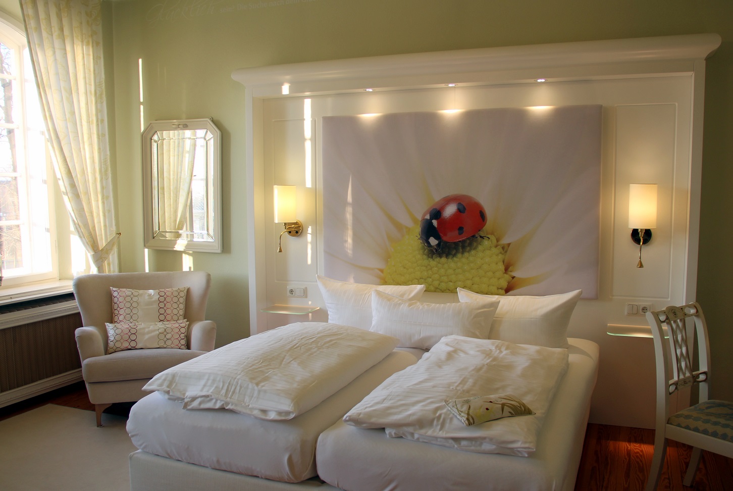 Dieses feine Plätzchen schwebte mir schon einige Zeit durch den Kopf und der Zufall wollte es, dass ich es schon über ein Jahr früher besuchte, als ursprünglich geplant. Immer wieder hatte ich mir vorab jedes der gerade mal sechs himmlisch schön gestalteten Zimmer angeschaut, obwohl ich von Anfang an in eines verliebt war: das Zimmer „Glück“. Das XXL Bild hinter dem Bett mit seinem Marienkäfer, knuspernd an einer Blüte, hatte sich tief in meinem Herz verankert.