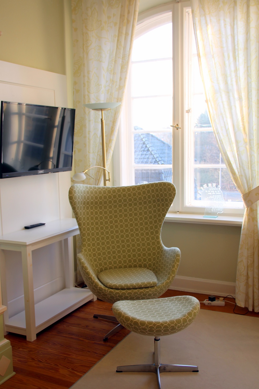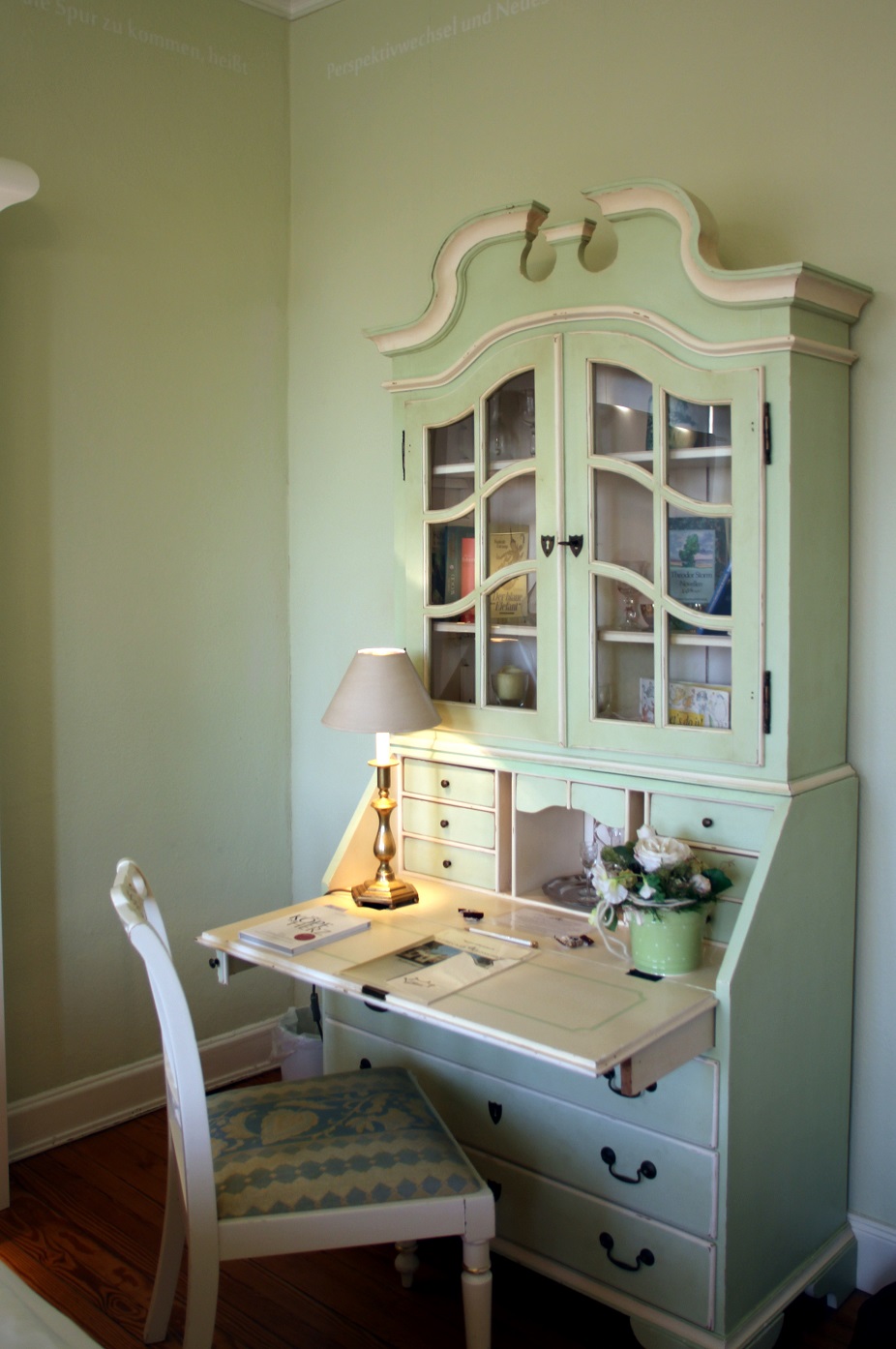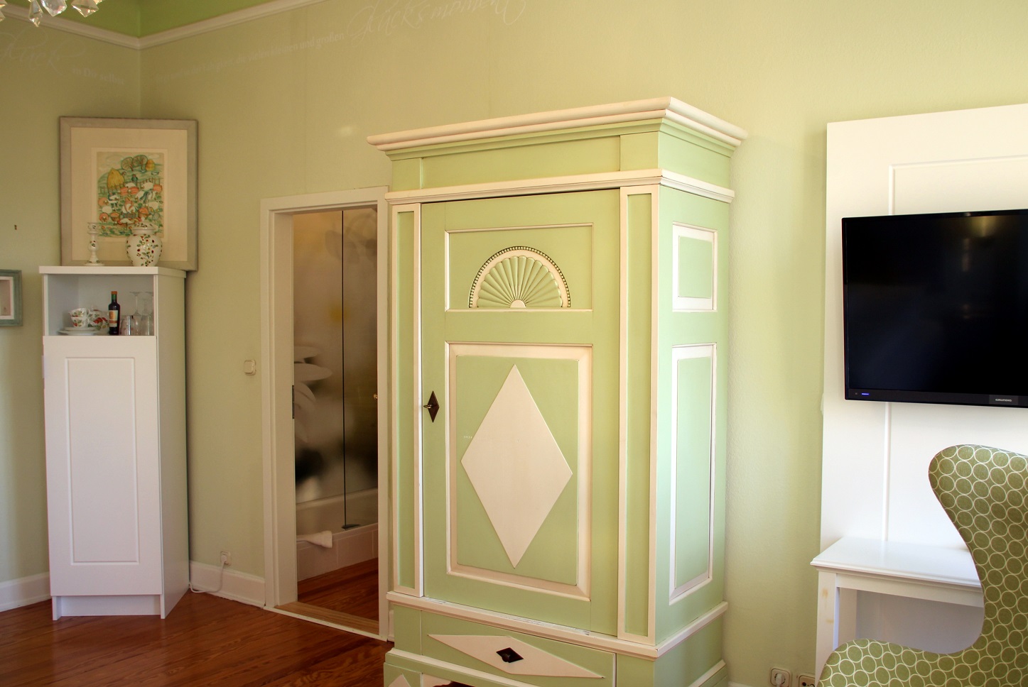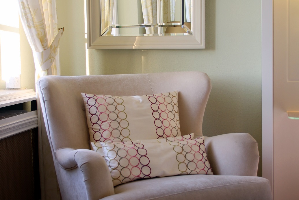 Später abends sitze ich in dem grünen Ohrensessel und lasse meinen Blick durch dieses unendlich schöne Zimmer schweifen. Es war, als würde irgendetwas in meinem Leben für fünf Minuten stoppen und sich nur dem Genuss dieser perfekt abgestimmten Grüntöne im Zimmer hingeben. Dieser Moment gehörte nur mir und mein Herz tanzte vor Freude diese kleine Feine-Plätzchen-Tour, die ich zum allerersten Mal ganz alleine machte, gestartet zu haben.