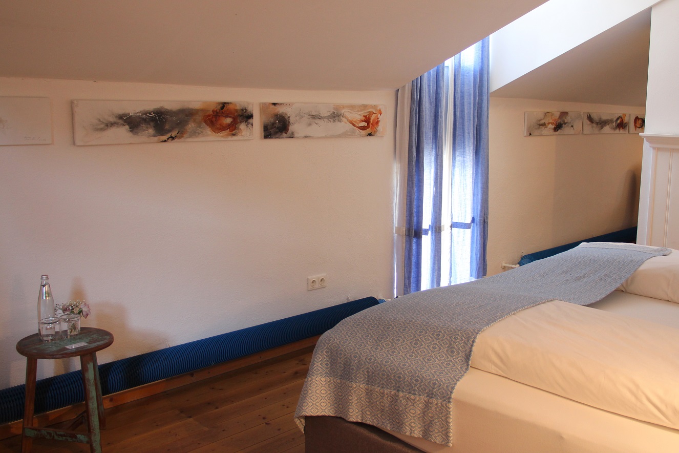 Selbst wenn das Wetter nicht so gut wäre – das Zimmer ist natürlich ebenfalls wunderschön ausgestattet, mit kunstvollen Bildern, kleiner Leseecke und einem sehr bequemen Boxspringbett. Dazu frische Blumen zur Begrüßung. Herrlich. Warum waren wir nur eine Nacht da?
