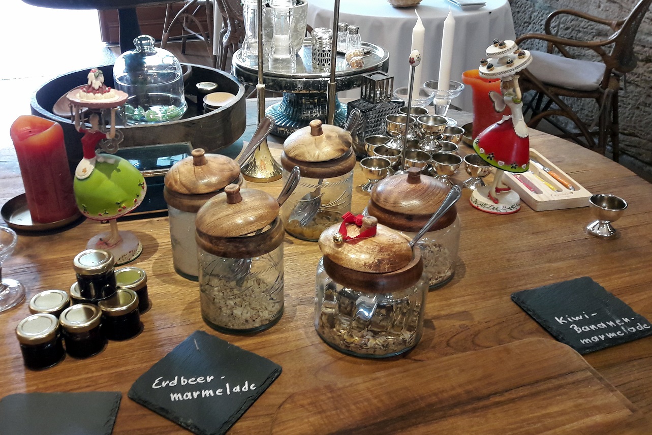 Aber dafür ein SUPER feines Frühstück in der ehemaligen Scheune des Hofes. Die Eierspeisen werden auf Wunsch und je nach Vorlieben frisch zubereitet und mit tollen Gewürzen verfeinert. Mein ganz persönliches Highlight – das servierte Dessert (wohlgemerkt zum Frühstück) – was für eine schöne Idee, die mir bisher noch in keinem Hotel begegnet ist, auch in keinem anderen feinen Plätzchen.