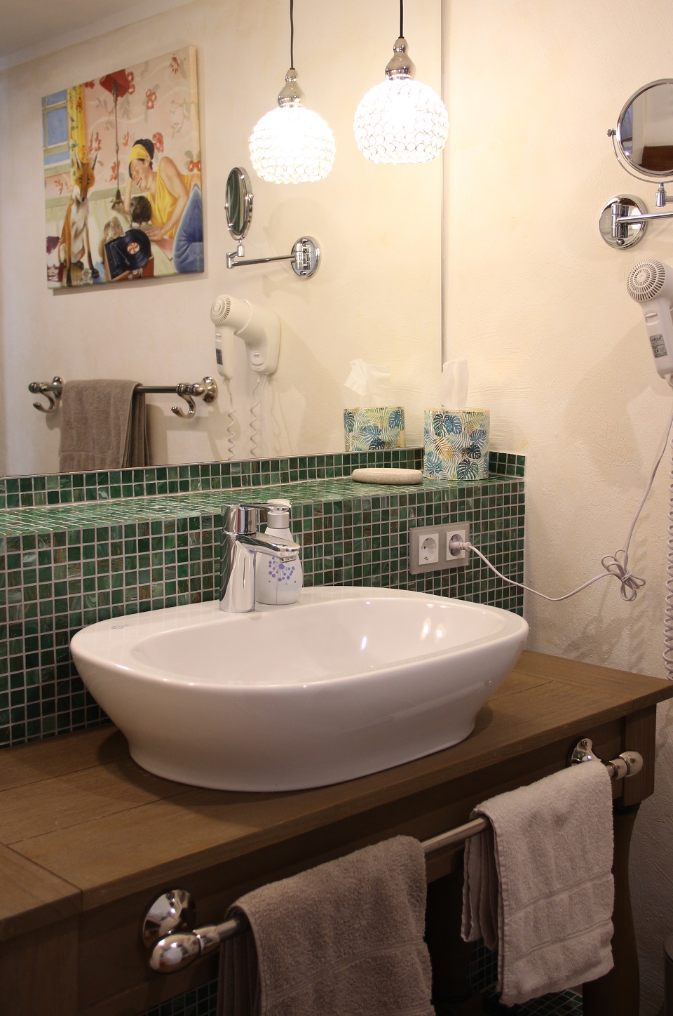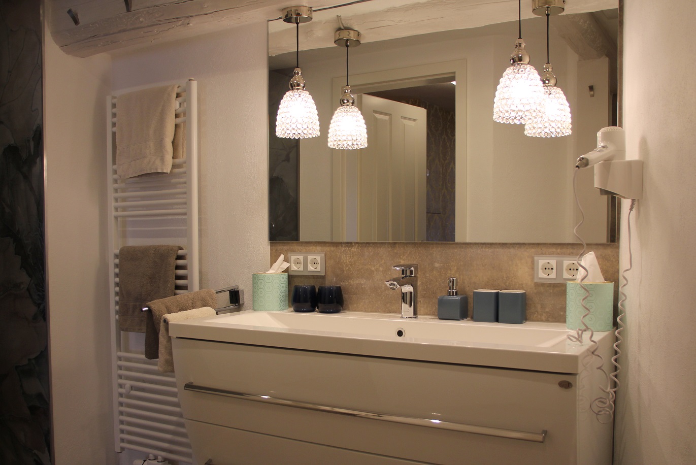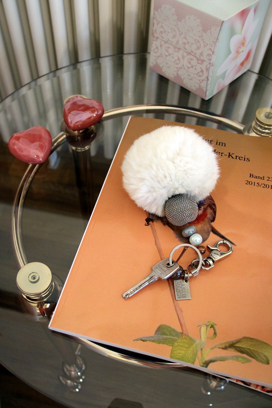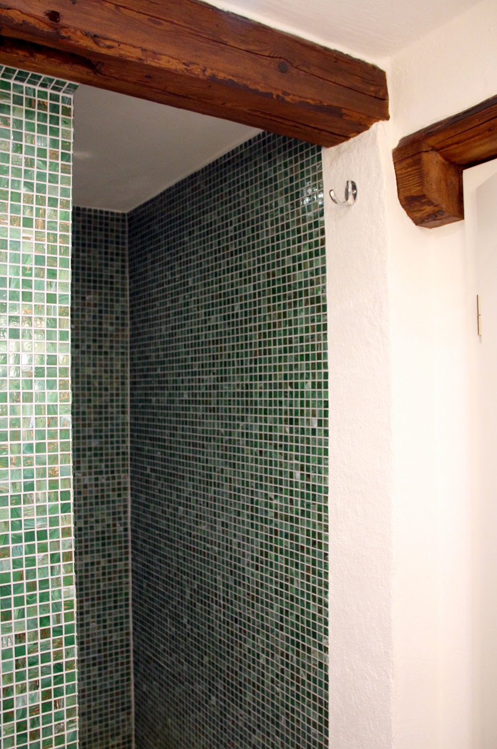 Besonders gut gefallen haben mir die Lampenschirme in meinem Zimmer, deren Glasfuß mit Kastanien gefüllt war. Und natürlich der süße antike Minischrank, der haargenau an seinen Platz passte. Dazu toll freigelegte Fachwerkbalken, Naturzeitschriften, feine Fliesen, zarte Pastelltöne und richtig schicke Schlüsselanhänger – supergut!