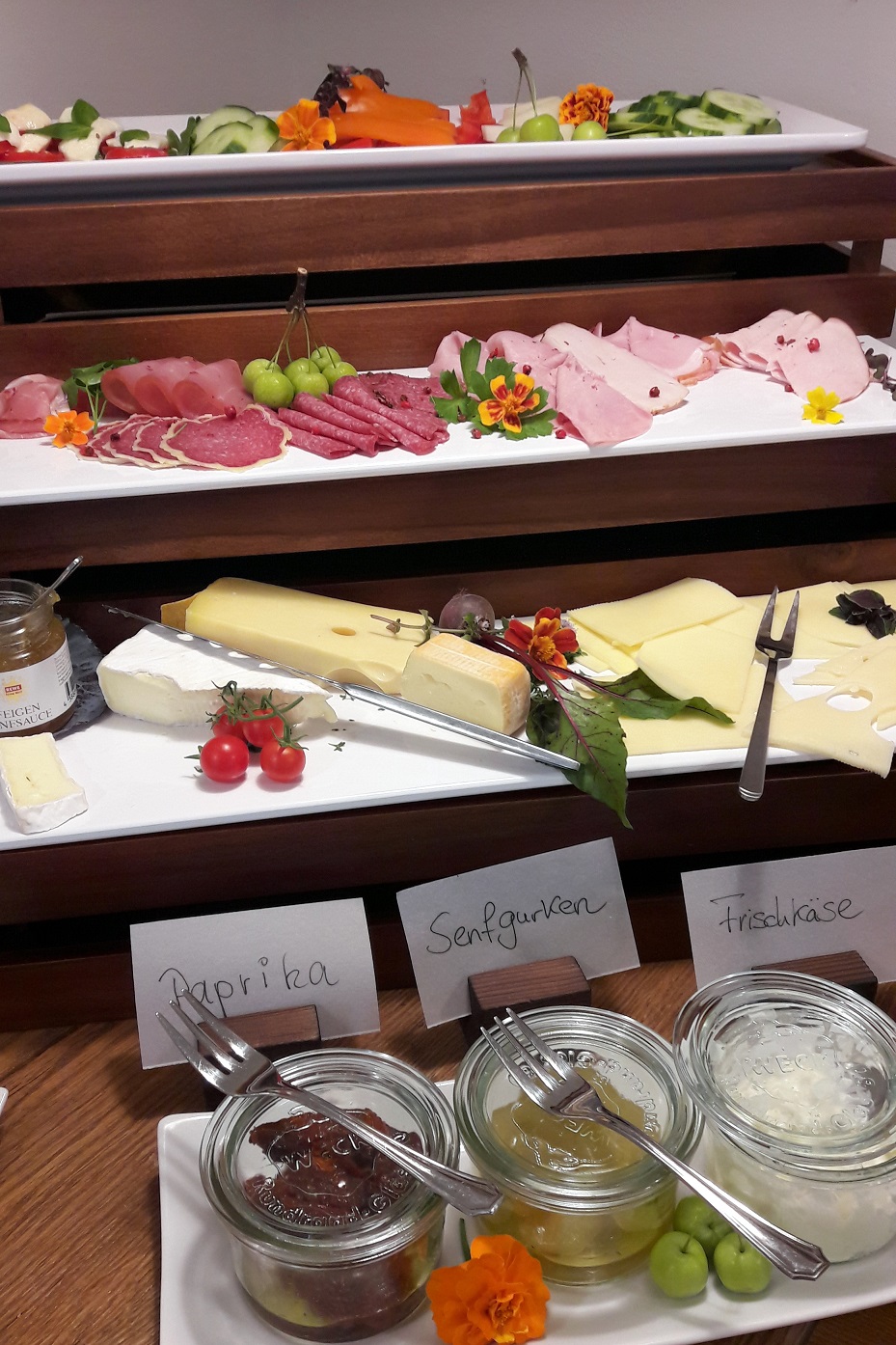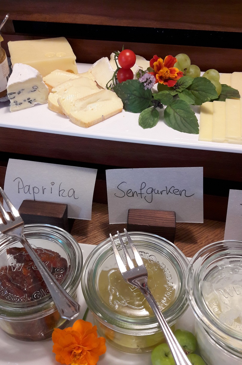 Wenn man sich dann noch dieses feine Buffet anschaut, mit all seinen Blütendekorationen und selbst gemachten Kreationen, wie z.B. dem Bruschetta, dann kann das Herz nur tanzen. Dazu gibt es noch kleine Obst-Schälchen und super krosse Brötchen.