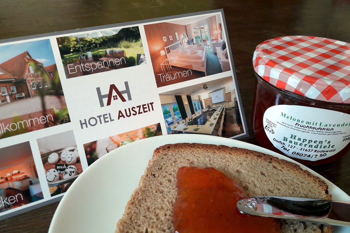 Als ich diesen Beitrag tippte, lag ich gerade Zuhause im Bett, einen kleinen Teller mit einer Scheibe Brot neben mir, die ich soeben mit dem köstlichen Fruchtaufstrich in der Sorte ‚Melone Lavendel‘ bestrichen hatte. Mhh, einfach toll :-). Wenige Tage zuvor hatte ich das feine Plätzchen ‚Hotel Auszeit‘ im Niedersächsischen Isernhagen (etwas nördlich von Hannover) besucht und gleich zwei Gläser dieser köstlichen Konfitüre erstanden – eine als Geschenk, eine für mich selbst. Was für ein Glück.