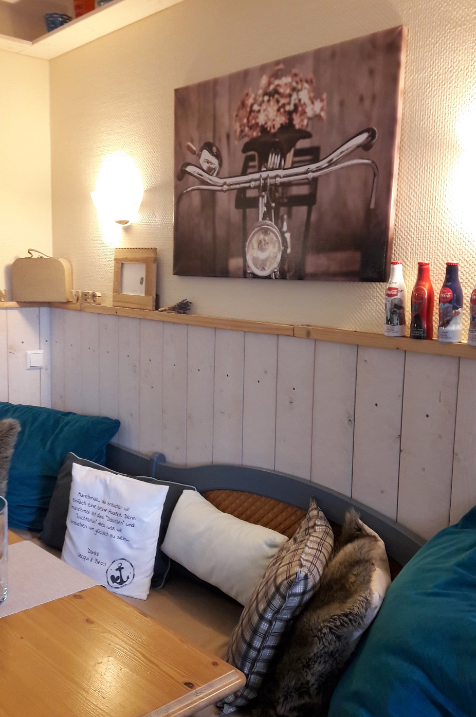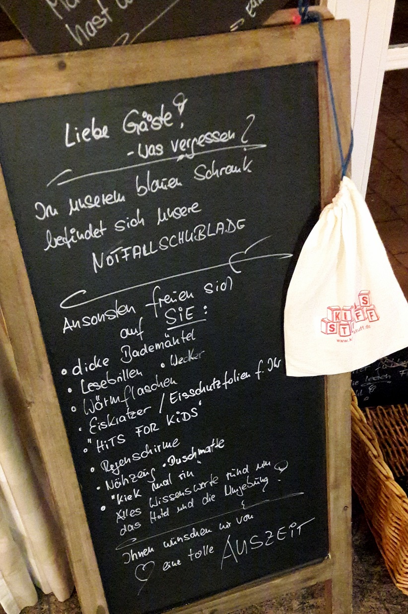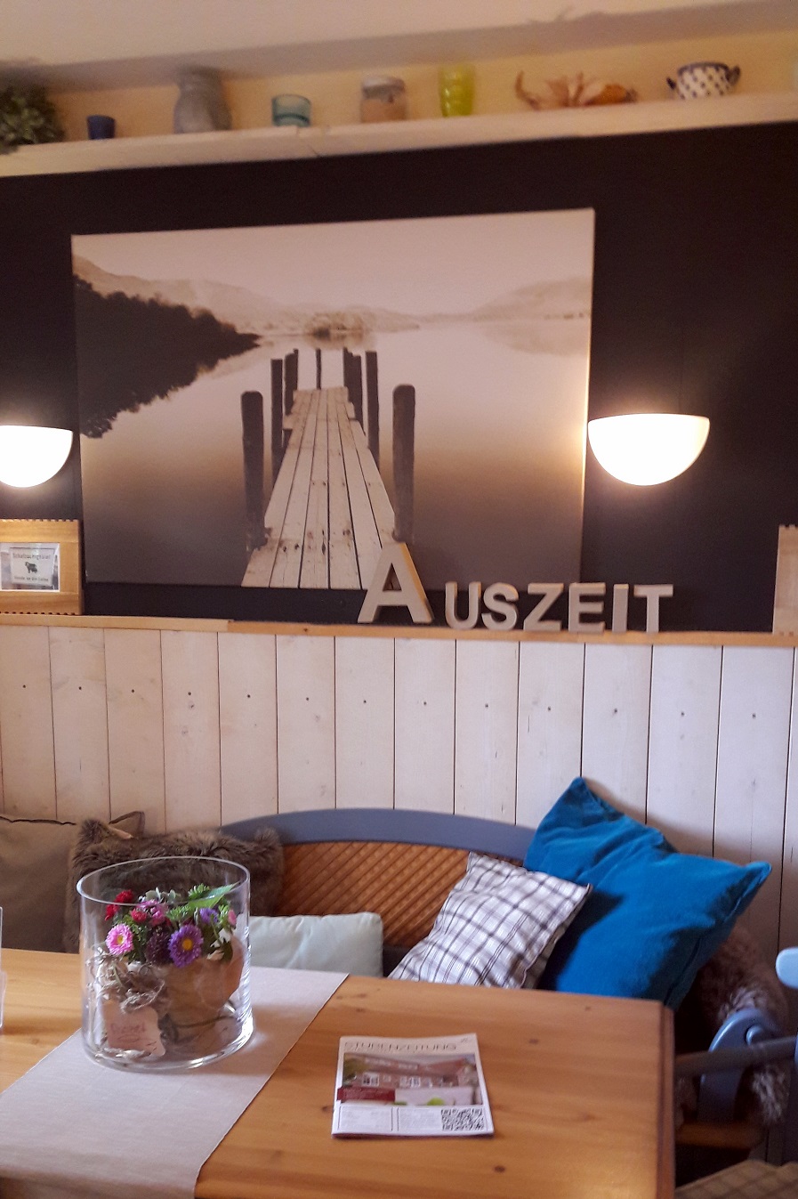 Da ist z.B. die ‚Lütte Stube‘ – direkt neben der Rezeption. Einmal eingetreten möchte man am liebsten für immer da bleiben, sich auf eine der Bänke in eine weiche Decke kuscheln, einen Tee dazu trinken und in einem der unzähligen Bücher aus dem ‚Auszeit-Reagl‘ (im Flur daneben) schmökern. Falls man als Gast übrigens etwas vergessen haben sollte: Kein Problem – wie gesagt – hier wird an alles gedacht, selbst an einen Notfallkorb samt Wecker, Schuhputzcreme, Eiskratzer, Waschmittel & Co.