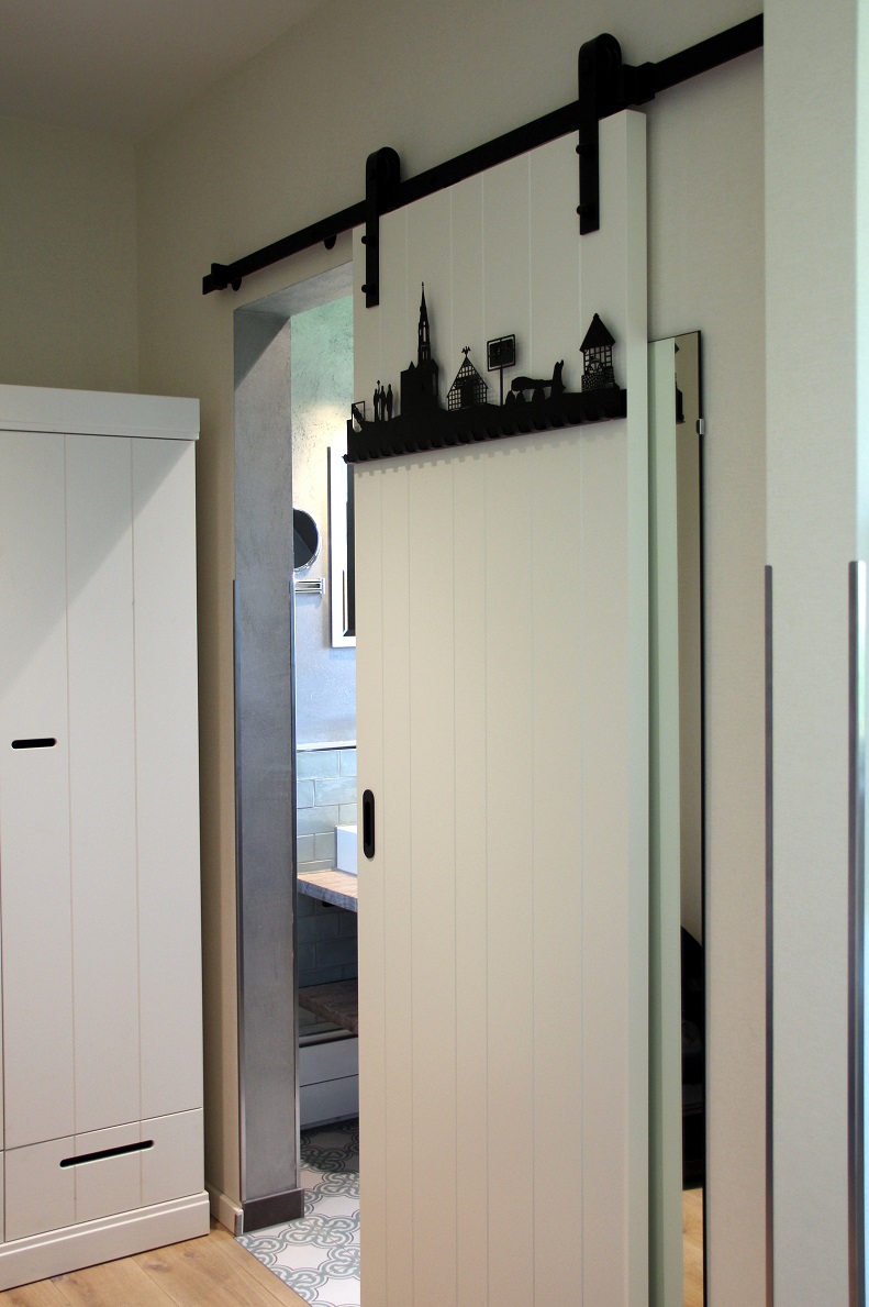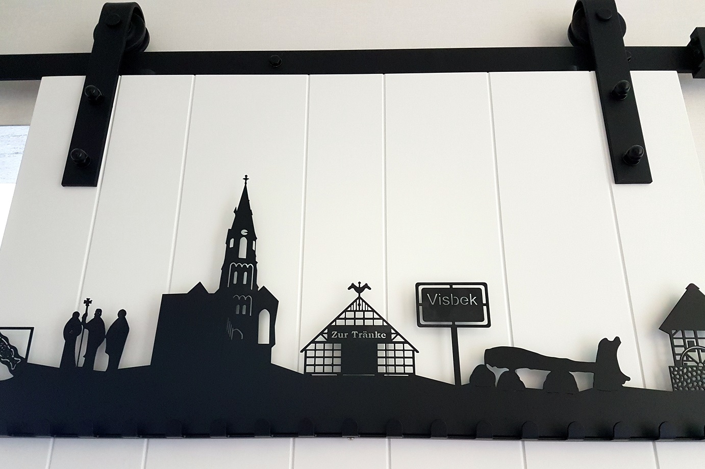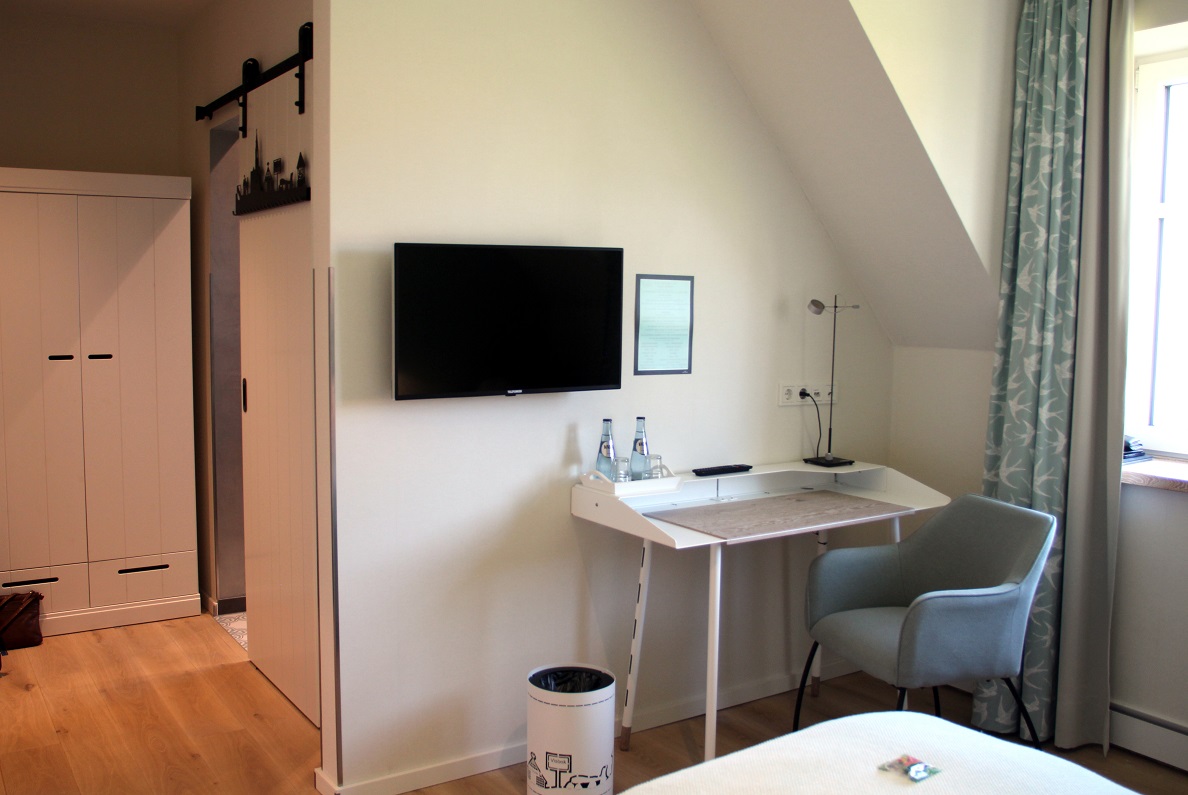 Ein superbequemes Boxspringbett stand vor einer feinen Strukturtapete im zarten grün-türkis (Wippis Farbdefinition, ohne Garantie) und man musste sich schon sehr zusammen reißen, sich nicht direkt abzulegen. Der regionale Bezug fehlt auch hier nicht – man beachte den Mülleimer mit dem Ortsschild Visbek, welches sich auch auf dem Garderobenhaken an der schiebbaren Badezimmertür wiederfindet.