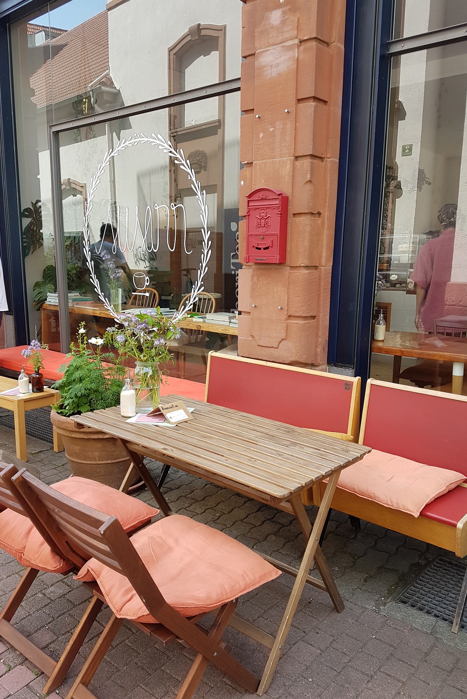 Kräuter, Grün, Natur pur und ganz viel gutes Lebensgefühl – das Feine Plätzchen Café “Susann” in Kaiserslautern lacht seine Gäste vom ersten Moment an. Uns vor allem die große, mit roten Sitzkissen bespannte Bank vor der noch größeren Fensterfront mit dem weißen Café Logo. Rechts und links gesäumt von einer üppigen Bepflanzung und natürlich fanden sich auch auf den Tischen frische Blumensträuße, die scheinbar gerade erst von einer bunten Blumenwiese gepflückt wurden.