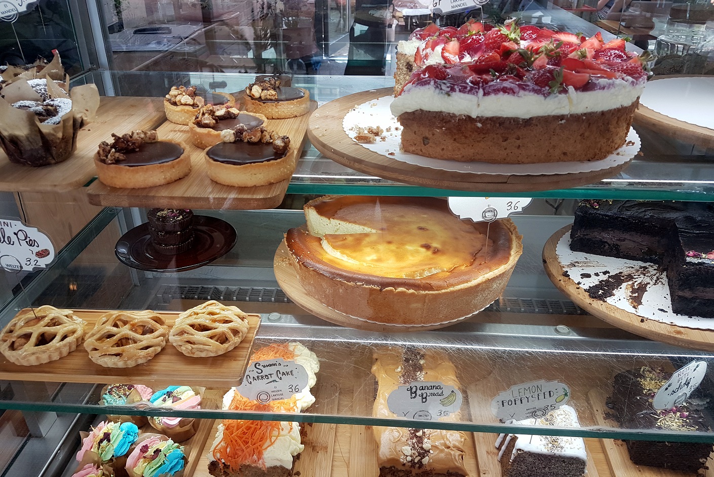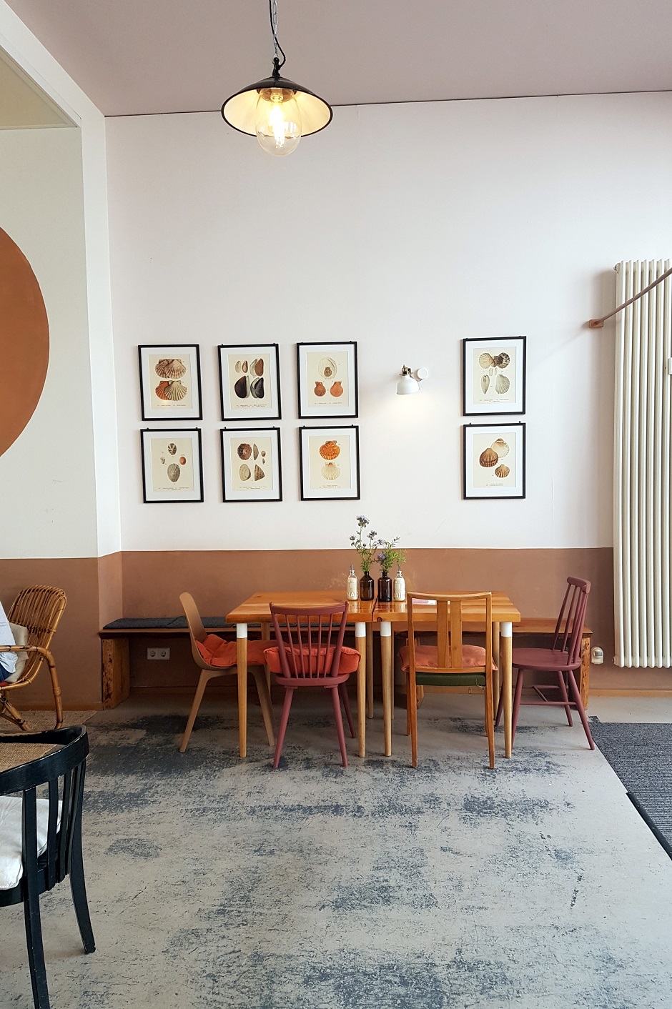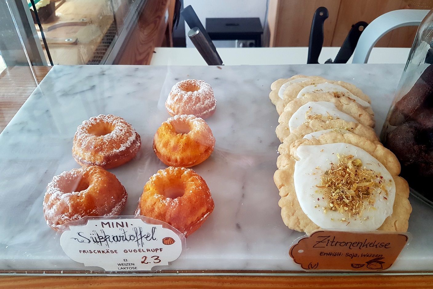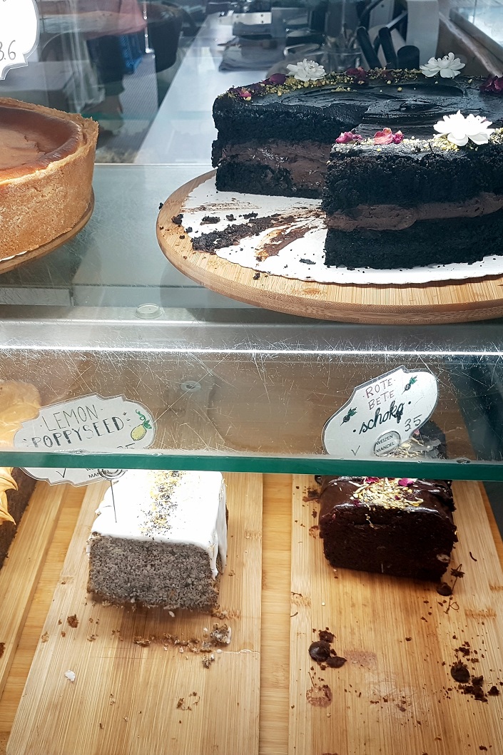 Dabei wäre es bestimmt auch auf der anderen Seite des Cafés, nämlich im wunderschön begrünten kleinen und hellen Innenhof sehr gemütlich gewesen, genau so wie im Café selbst. Hohe Deckenwände, riesige Fensterfronten, natürlich Farben und Materialien, dazu viel Grün und viele Köstlichkeiten in der Theke – wow, einfach nur bezaubernd.