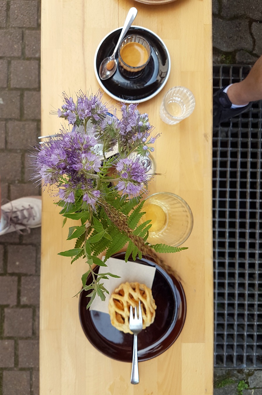 Und die Gerichte sind mega lecker. Ich wählte das Omelett mit Spinat, der Mann an meiner Seite das Käse-Gurken-Senf-Sandwich und so saßen wir urgemütlich und entspannt bei sommerlichen Außentemperaturen auf diesem herrlichen Außenplatz vorm Café. Am liebsten wären wir nie wieder weggegangen, so angenehm war es. Mitten im Leben & mitten im Grünen (den üppig bepflanzten Blumenkübeln rechts und links der Hauswand sei Dank).