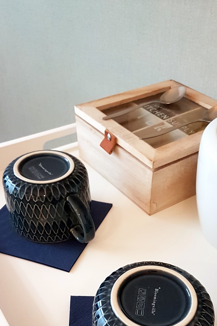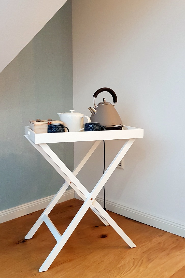 Oder das herrlich gemütlich eingerichtete Zimmer mit Kopfkissenauswahl, feiner Tapete, schicken Lampen und einer üppigen Teestation. So sitzt man also schön eingekuschelt mit einer großen Tasse Tee am Abend am Fenster und lässt einfach mal die Seele baumeln. Genau so, wie sich die Gastgeber das vorgestellt und mit ihrem „Anno 1910“ geschaffen haben.